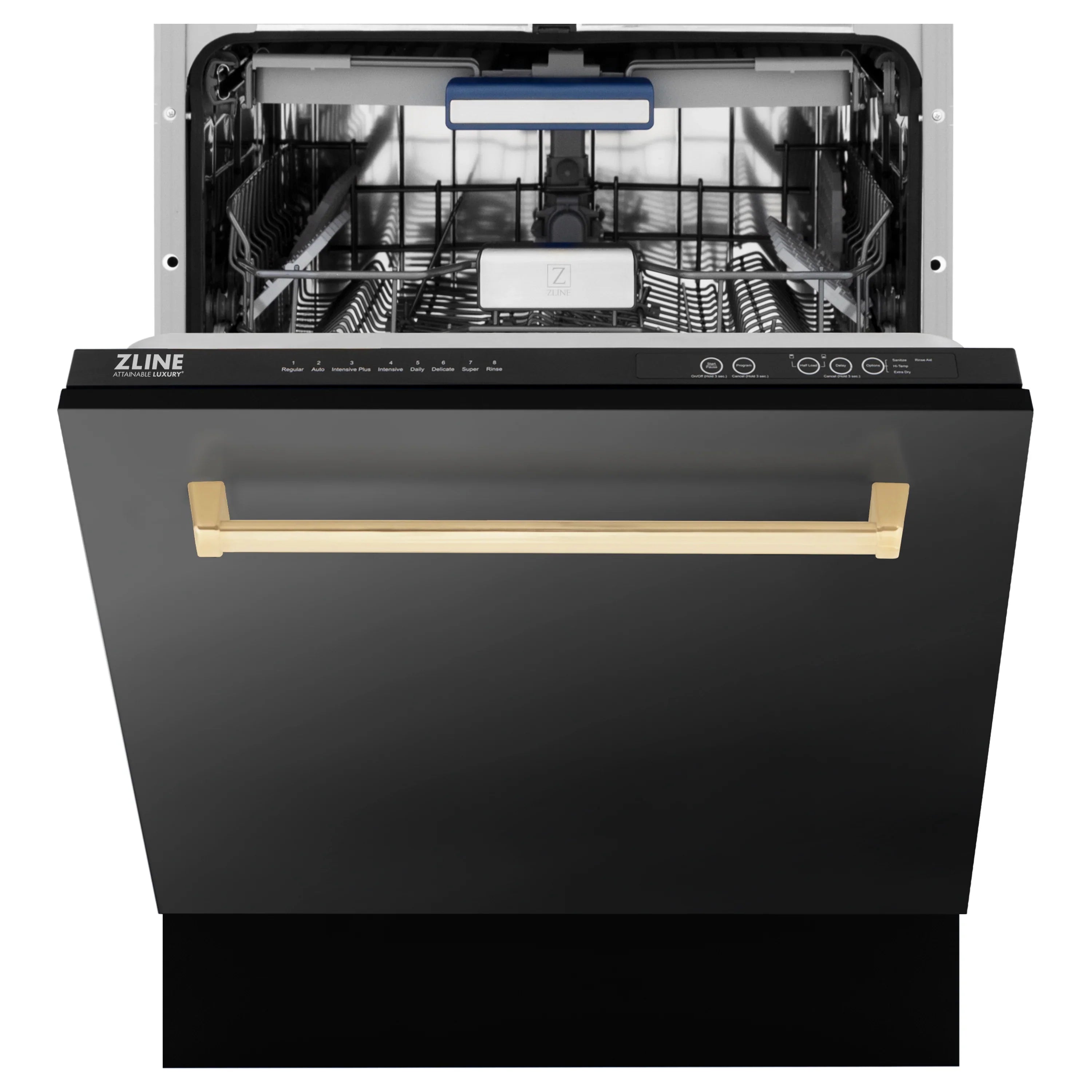 The ZLINE Autograph Series Black Dishwasher (DWVZ-BS-24-G) comes fully equipped with 3 racks, maximizing place settings with a stunning Gold Handle. Clean your dishes with ease with this ZLINE Dishwasher!