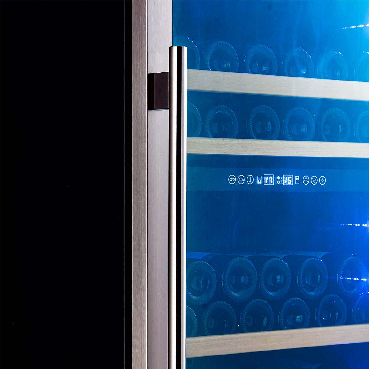 Triple-Layer Anti-UV Glass Door. Stainless steel door frame with triple-layer glass prevents condensation. UV protection maintains wine quality.