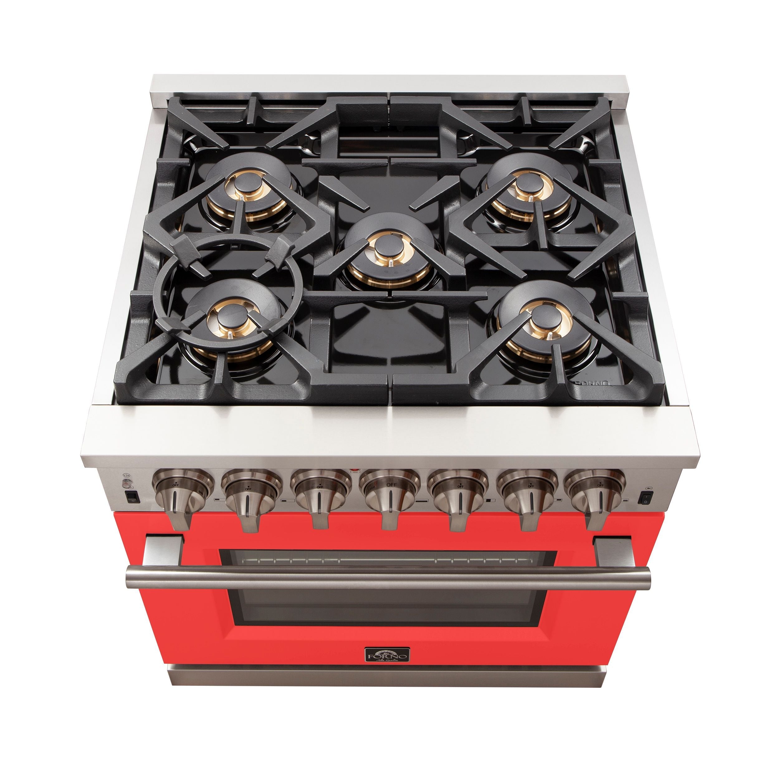 The Forno Capriasca 30 Inch Gas Range enhances your home kitchen with professional styling and performance through its durable and beautiful 304-grade stainless-steel design. The cooking surface features 5 sealed dual-ring brass burners, totaling 100,000 BTU. All burners, each at 20,000 BTU, can simmer precisely at 1,000 BTU. Continuous heavy-duty cast-iron grates facilitate easy sliding of pots or pans off heat over the enamel cooktop cavity, simplifying spill cleanup. The 4.32 cu. ft. gas oven, with a 30,000 BTU output and infrared red mesh broiler, enclosed in a blue enamel interior, offers optional convection for precise, and consistent cooking on multiple levels. For convenient viewing, a 3-layer glass oven door window is included. The package includes 3 telescopic stainless-steel oven racks, wok support, and an LP conversion kit. Additionally, zinc-coated illuminated metal knobs with bezel rings ensure enduring beauty.