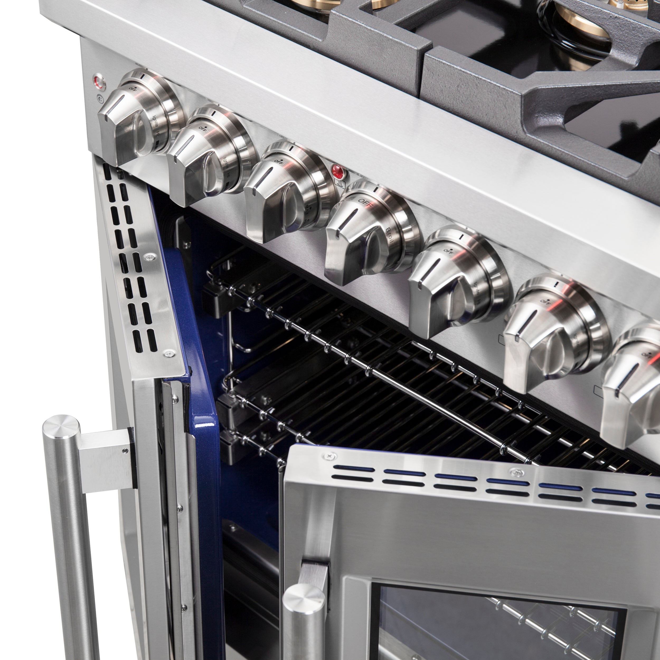 The Forno Capriasca 30-Inch French Door Dual Fuel Range harmonizes professional styling and performance into your home kitchen with its durable stainless-steel design. Unique French doors offer up to 12 inches of additional space when open, making oven access easier and more efficient. The gas range-top features 5 sealed dual-ring brass burners with a total output of 100,000 BTU, including a 20,000 BTU dual-ring burner ideal for boiling, searing, or precisely simmering sauces and melting chocolate. Heavy-duty continuous cast iron grates offer cookware stability and effortless movement over a recessed enamel cooking surface that helps contain spills for easy cleaning. The spacious 4.32 cu. ft. electric oven, with a 6,300-watt output and a true convection fan, ensures fast, precise, and even cooking. A 3-layer glass oven door window offers convenient viewing. Included accessories: LP conversion kit, 3 stainless steel telescopic oven racks, wok ring, reversible griddle, rotisserie kit with skewers, air fry basket with rack and drip pan. Zinc-coated metal knobs with bezel rings add a touch of enduring elegance.