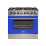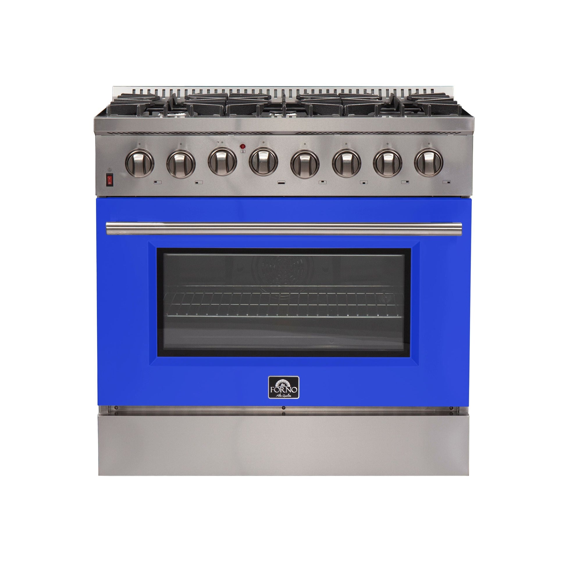 The Forno Galiano 36" Dual Fuel Range in crisp blue with antique brass accents is a harmonious blend of classic elegance and high-performance functionality. Its timeless design, featuring a striking combination of a blue finish, antique brass knobs and handles, and contrasting black and stainless steel details, brings sophistication and durability to any kitchen. Equipped with six powerful sealed burners and a spacious convection oven, this range offers versatility, efficiency, and ease of use for any cooking task.