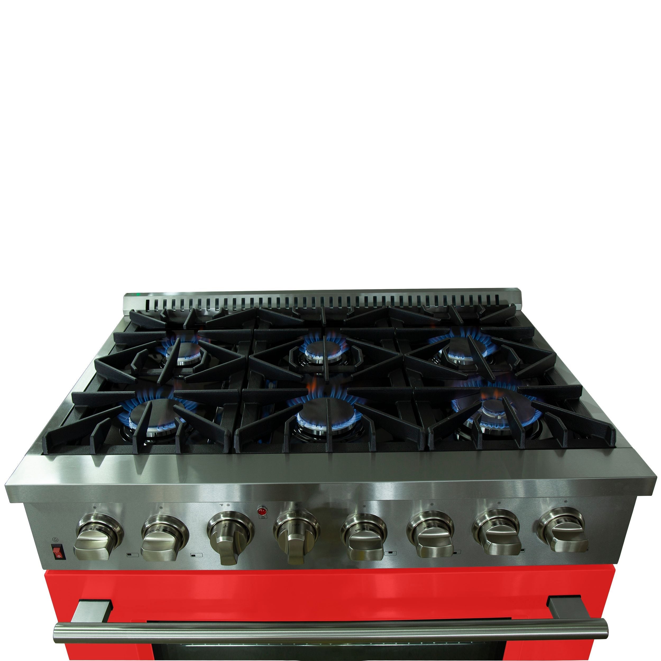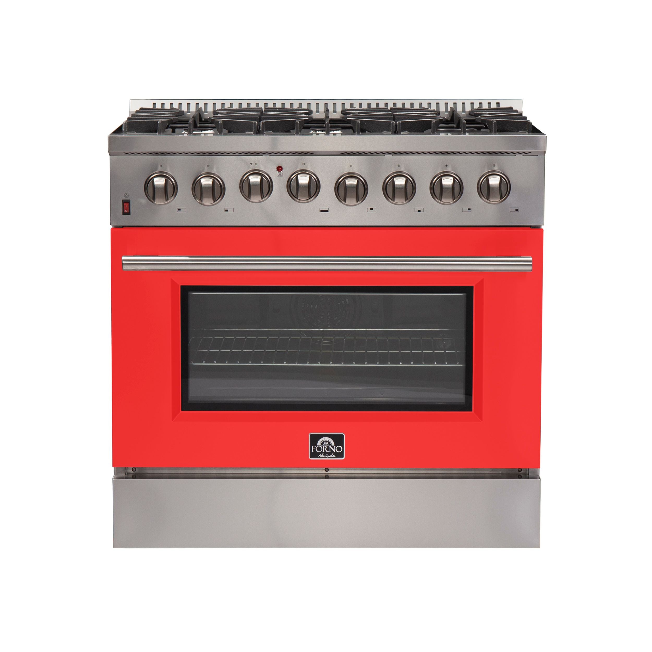 The Forno Galiano 36" Dual Fuel Range in crisp red with antique brass accents is a harmonious blend of classic elegance and high-performance functionality. Its timeless design, featuring a striking combination of a red finish, antique brass knobs and handles, and contrasting black and stainless steel details, brings sophistication and durability to any kitchen. Equipped with six powerful sealed burners and a spacious convection oven, this range offers versatility, efficiency, and ease of use for any cooking task.