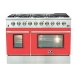 The Forno Galiano 48" Gas Range in crisp red with antique brass accents is a harmonious blend of classic elegance and high-performance functionality. Its timeless design, featuring a striking combination of a red finish, antique brass knobs and handles, and contrasting black and stainless steel details, brings sophistication and durability to any kitchen. Equipped with eight powerful sealed burners and a spacious convection oven, this range offers versatility, efficiency, and ease of use for any cooking task.