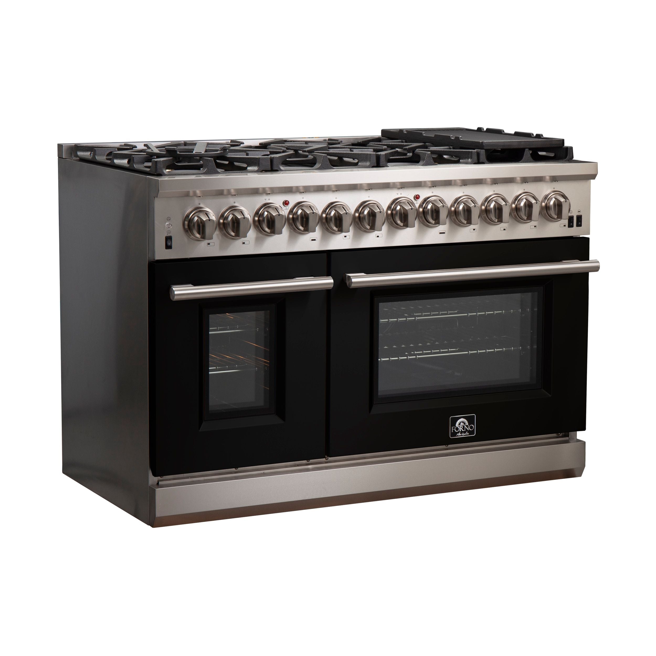 The Forno Capriasca 48 Inch dual fuel range brings professional styling and performance into your home kitchen with its durable and beautiful 304 grade stainless steel design. The cooking surface features 8 sealed dual-ring brass burners with a total output of 160,000 BTU. The 20,000 BTU dual-ring burners are perfect for boiling or searing and can also handle tasks like melting chocolate or simmering sauces. Continuous heavy-duty cast-iron grates allow for easy sliding of pots or pans off heat when desired. The two ovens have a combined capacity of 6.58 cu.ft. and boast a total output of 9,700 Watts, providing ample power for baking, roasting, and broiling. The blue enamel interiors make cleaning a breeze, while the 3-layer glass oven door window provides both heat retention and an unobstructed view. The right-side oven features a true convection fan function. Included are 6 fully telescopic easy-access stainless steel oven racks, reversible grill/griddle, complete rotisserie kit including skewer and forks, concave wok ring, an LP conversion kit and a NEMA 14-50P power cord. Additionally, zinc-coated metal knobs with bezel rings will maintain their beauty for years.