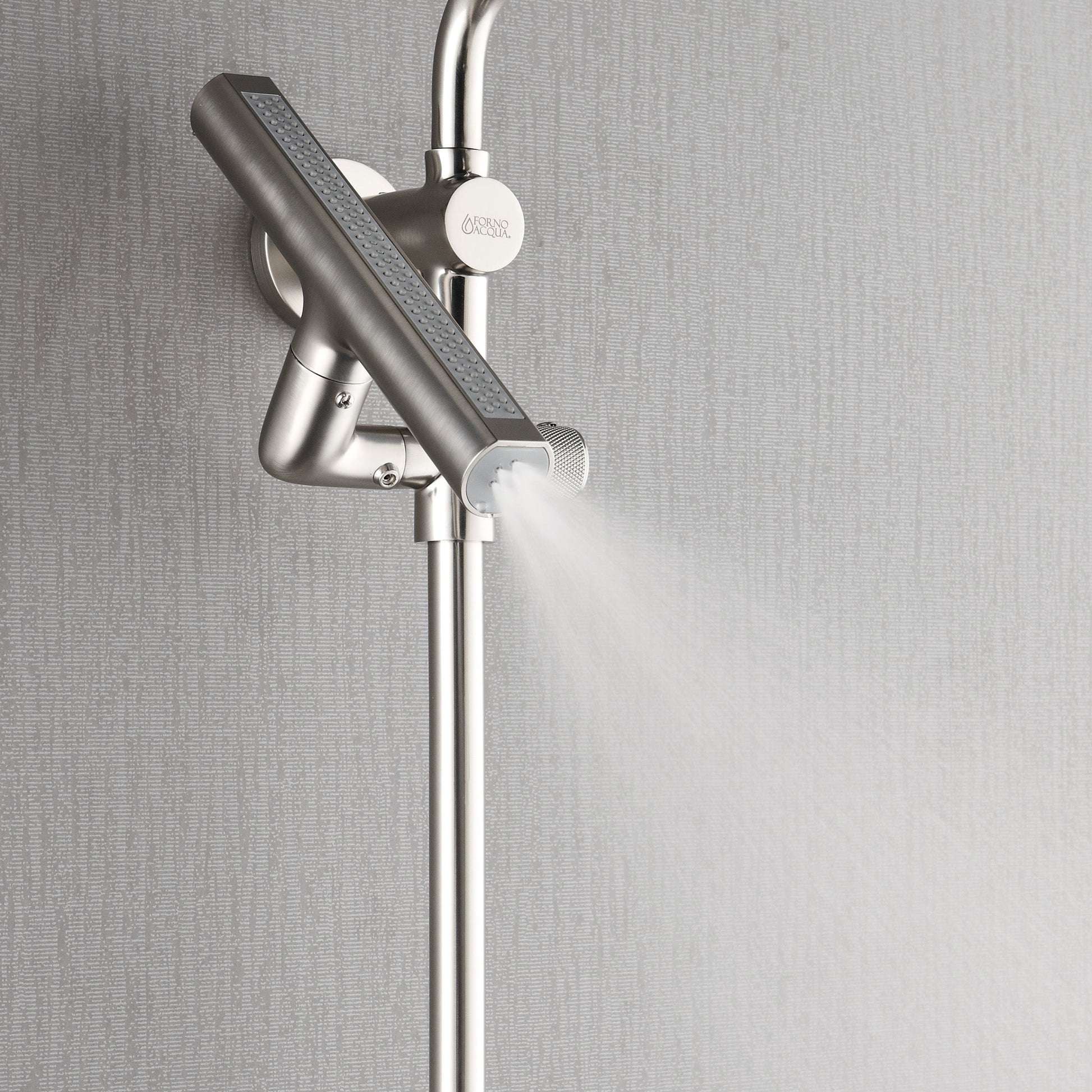 Refresh your shower experience with the FORNO ACQUA AcquaSPA Shower Column, where Italian-inspired design meets modern innovation for a spa-like escape at home. Enjoy the oversized 9" rain shower head that delivers full-body coverage, or the revolutionary AcquaFALL Waterfall Jet with a wide 10-1/2" outlet and adjustable angle for soothing relief on the shoulders and neck. The 5-function ergonomic handheld slides easily along the integrated adjustable bar, offering comfort for every member of the family. Designed for quick DIY wall-mount installation using standard U.S. plumbing, this durable brushed nickel system blends luxury, practicality, and wellness into every shower.