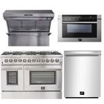 The Forno Appliance Package - 48 in. Galiano Dual Fuel Range with 8 Defendi Italian Burners in Stainless Steel, Wall Mount Range Hood with Back Splash, Microwave Drawer and Dishwasher. This appliance package is perfect for your next kitchen model, and comes at a highly affordable price! Read more below!