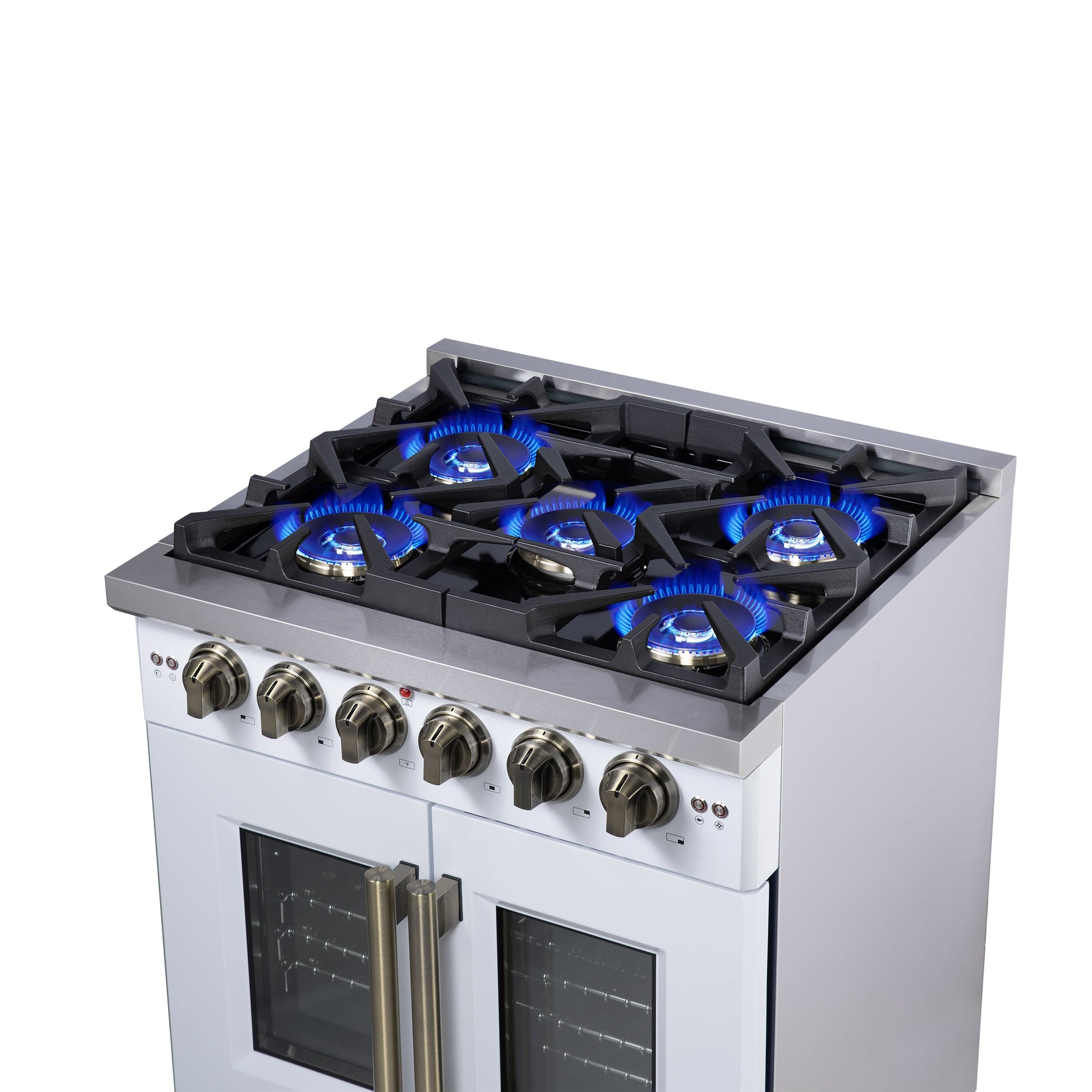Bring performance and sophistication to your kitchen with the 30 Inch Forno Capriasca French Door Gas Range in a timeless white finish. Designed for professional-grade results, it features French doors for effortless oven access, five dual-ring brass burners delivering a powerful 100,000 BTUs, and a recessed black enamel cooktop for easy cleaning. The spacious 4.32 cu. ft. oven with convection fan and 30,000 BTU output ensures even cooking, while its elegant design is matched by high-performance accessories for every culinary need—from griddling and roasting to air frying. With durable construction, precision controls, and sleek styling, this range is built to stand out and perform.