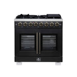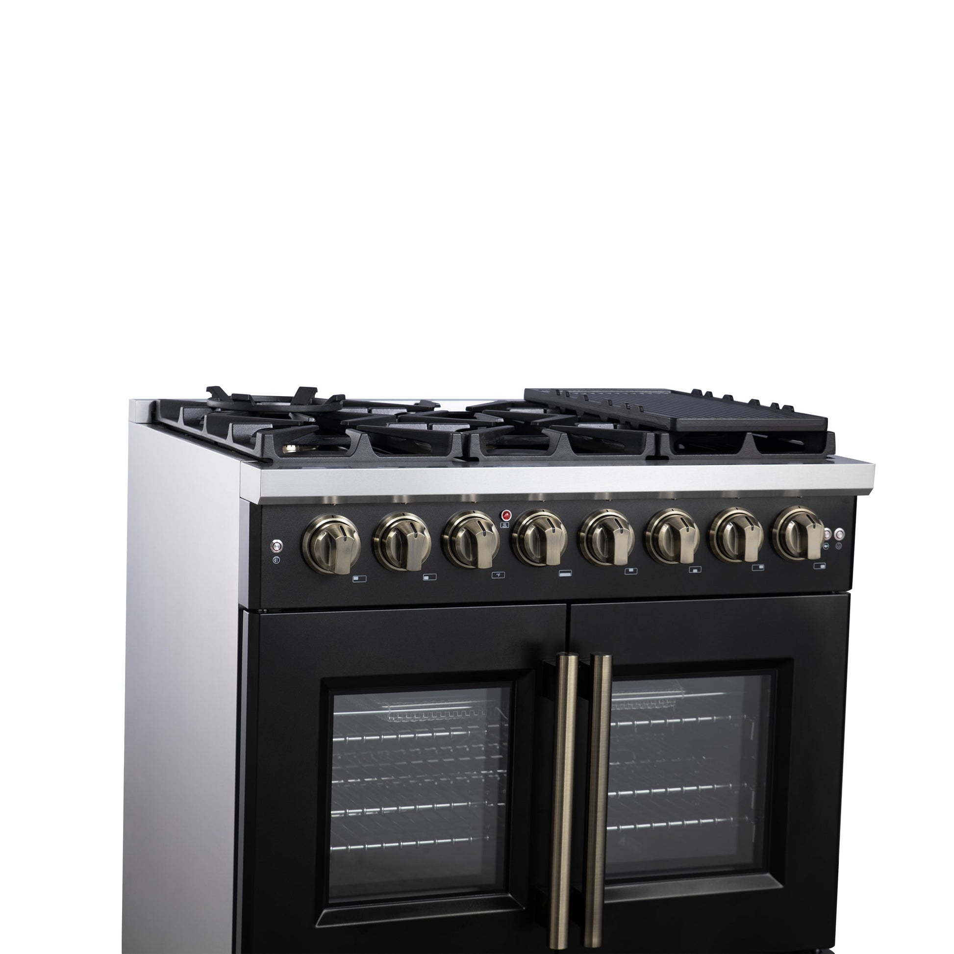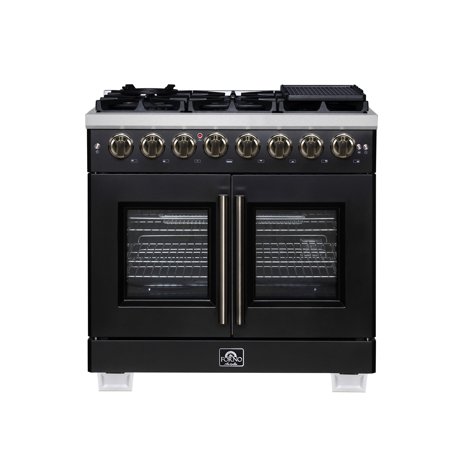 The Forno Capriasca 36 Inch Freestanding French Door Dual Fuel Range in black with antique brass accessories brings professional-grade performance and timeless styling to your kitchen. Its signature French doors open outward, providing up to 12 inches of additional clearance for easier, safer oven access. The cooktop features six sealed dual-ring brass burners with a total output of 120,000 BTUs, including a powerful burner ideal for rapid boiling, high-heat searing, or gentle simmering. Heavy-duty continuous cast iron grates provide stability and effortless movement of cookware, while the recessed black enamel cooktop cavity helps contain spills for quick cleanup. Inside, the spacious 5.36 cu. ft. electric oven delivers 6,300 watts of cooking power with true convection, ensuring fast, precise, and consistent results. A speckled blue enamel interior offers durability and easy maintenance, while the triple-layer glass oven door ensures heat retention with clear visibility. Premium accessories, including three stainless steel telescopic oven racks, LP conversion kit, wok support, reversible griddle, rotisserie kit with skewers, and an air fry basket with rack and drip pan, make this range a complete cooking solution for every home chef.