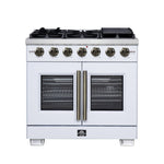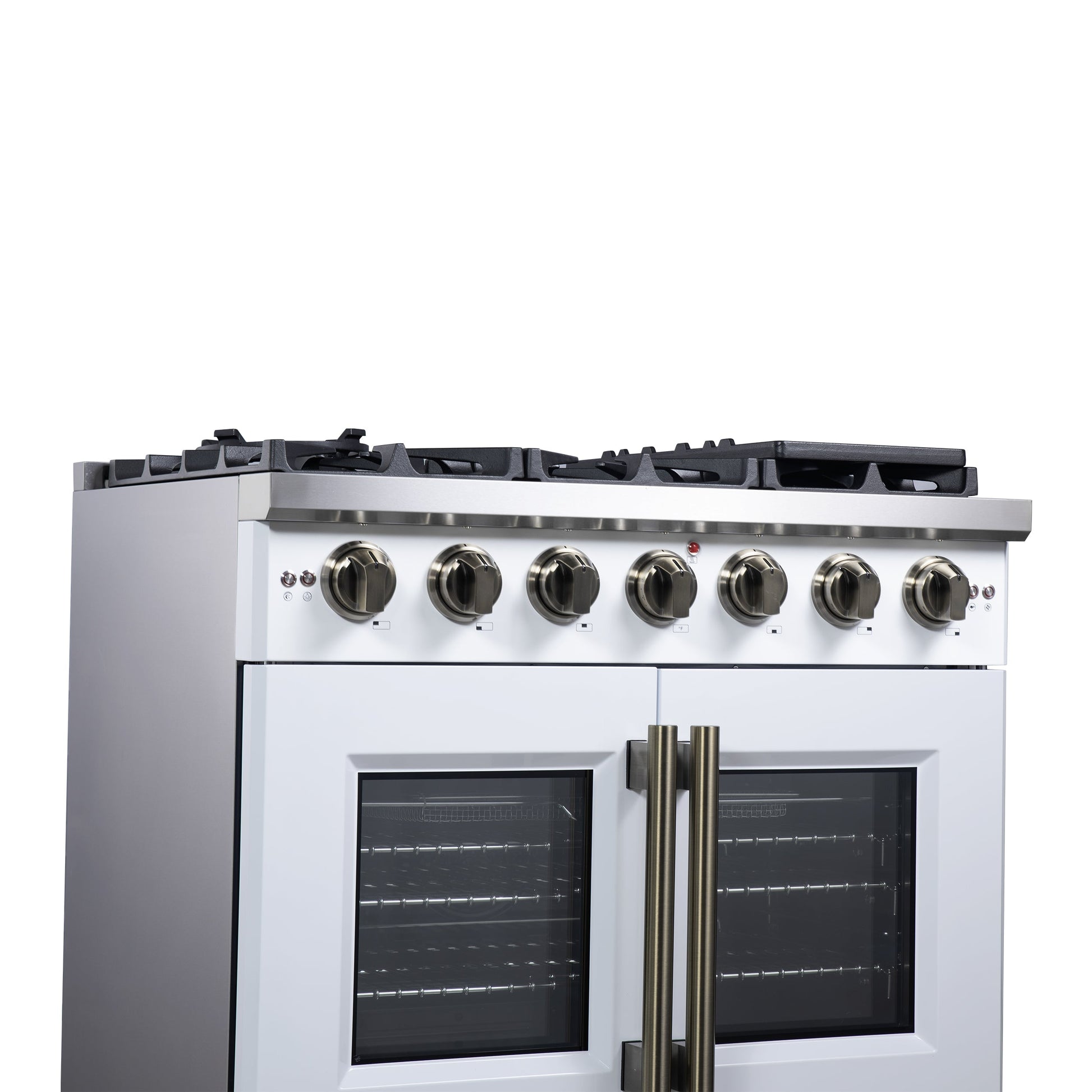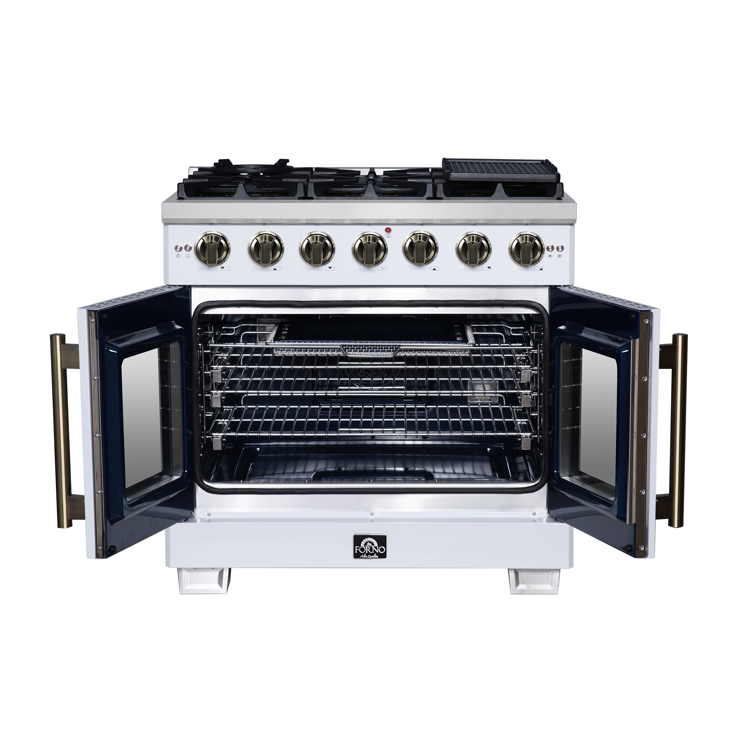 The 36 Inch Forno Capriasca French Door Gas Range in White elevates your home kitchen with professional style and performance. Its unique French doors provide an extra 12 inches of access space to the oven. The range top boasts 6 sealed dual-ring brass burners, delivering a total output of 120,000 BTU for precise tasks like simmering or melting chocolate. Heavy-duty continuous cast iron grates cover a recessed enamel cooking surface, which contains spills for easy cleaning. The 5.36 cu. ft. gas oven, with a 30,000 BTU output, features a speckled blue enamel interior, convection fan, and a 3-layer glass oven door window for fast and precise cooking. The package includes an LP conversion kit, 3 stainless steel telescopic oven racks, wok support, reversible griddle, rotisserie kit, skewers forks, air fry basket, and drip pan. The illuminated zinc-coated metal knobs with bezel rings add a touch of elegance that lasts for years.