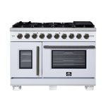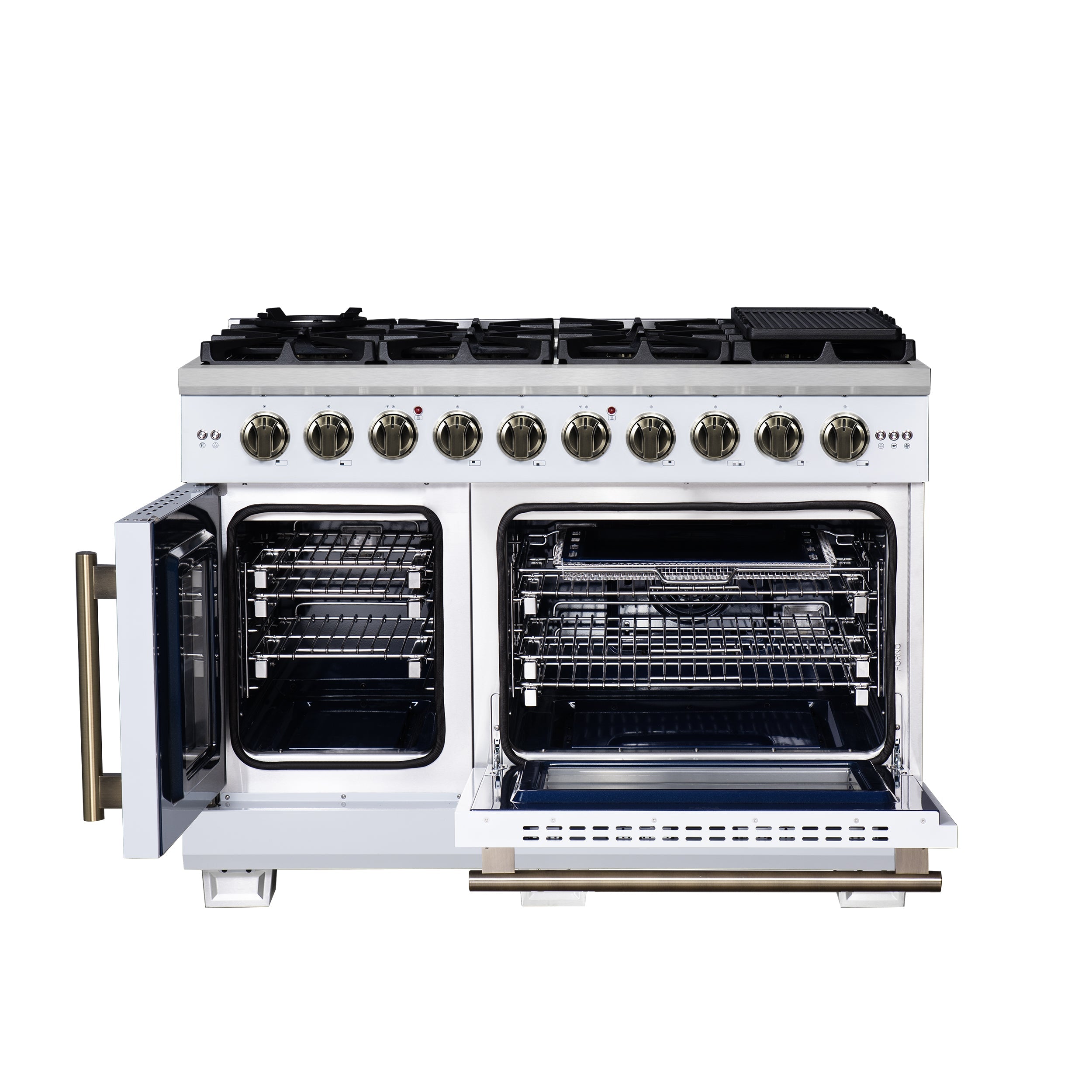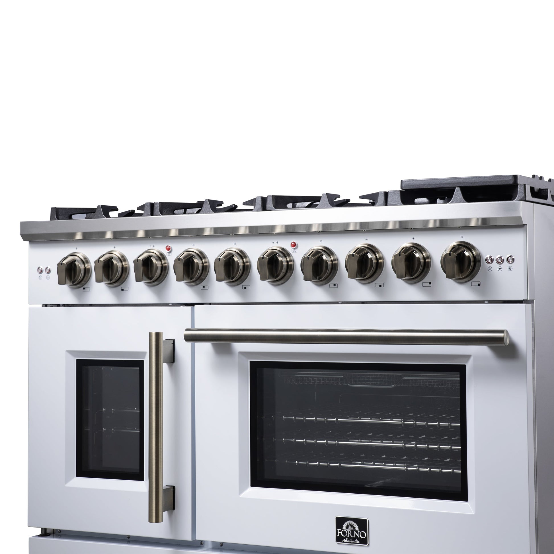 The Forno Capriasca 48 Inch French Door Gas Range in White enhances your home kitchen with professional styling and top-tier performance. The cooking surface features 8 sealed dual-ring brass burners, totaling 160,000 BTU. Each burner offers 20,000 BTU, with the ability to simmer as low as 1,000 BTU. Heavy-duty continuous cast-iron grates provide smooth cookware movement and cover a recessed enamel cooktop that makes spill cleanup easy. The 6.58 cu. ft. double ovens, with a 44,000 BTU output, are enclosed in a speckled blue enamel interior. The main oven features a 10,000 BTU infrared mesh broiler, rotisserie skewer, and a convection fan for precise and consistent cooking on multiple levels. The package includes 6 telescopic stainless-steel oven racks, a rotisserie kit, wok support, griddle, air fryer kit, and an LP conversion kit. Zinc-coated illuminated metal knobs with bezel rings add a touch of elegance.