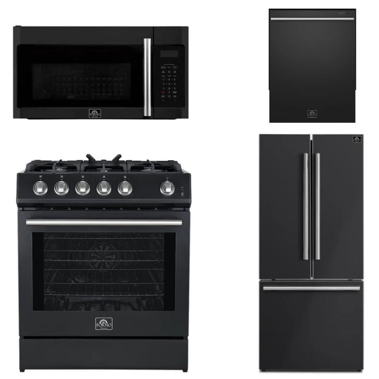 Upgrade your kitchen with the FORNO Espresso Package in a sleek black finish with silver accents, designed to deliver both performance and elegance. This four-piece set includes a powerful 30" gas range, a versatile over-the-range microwave, a compact 30" French door refrigerator with ice maker, and a quiet, efficient dishwasher—crafted to handle cooking, storage, and cleaning needs with modern convenience.