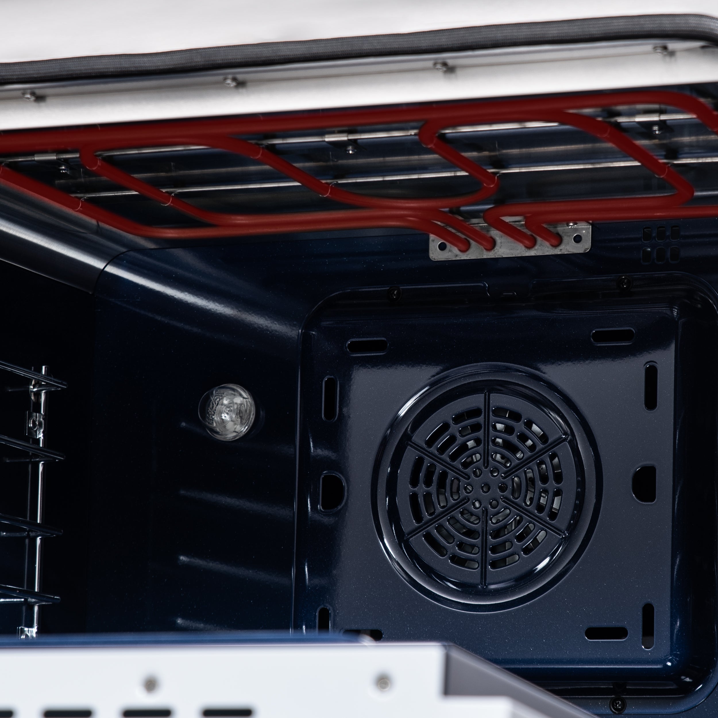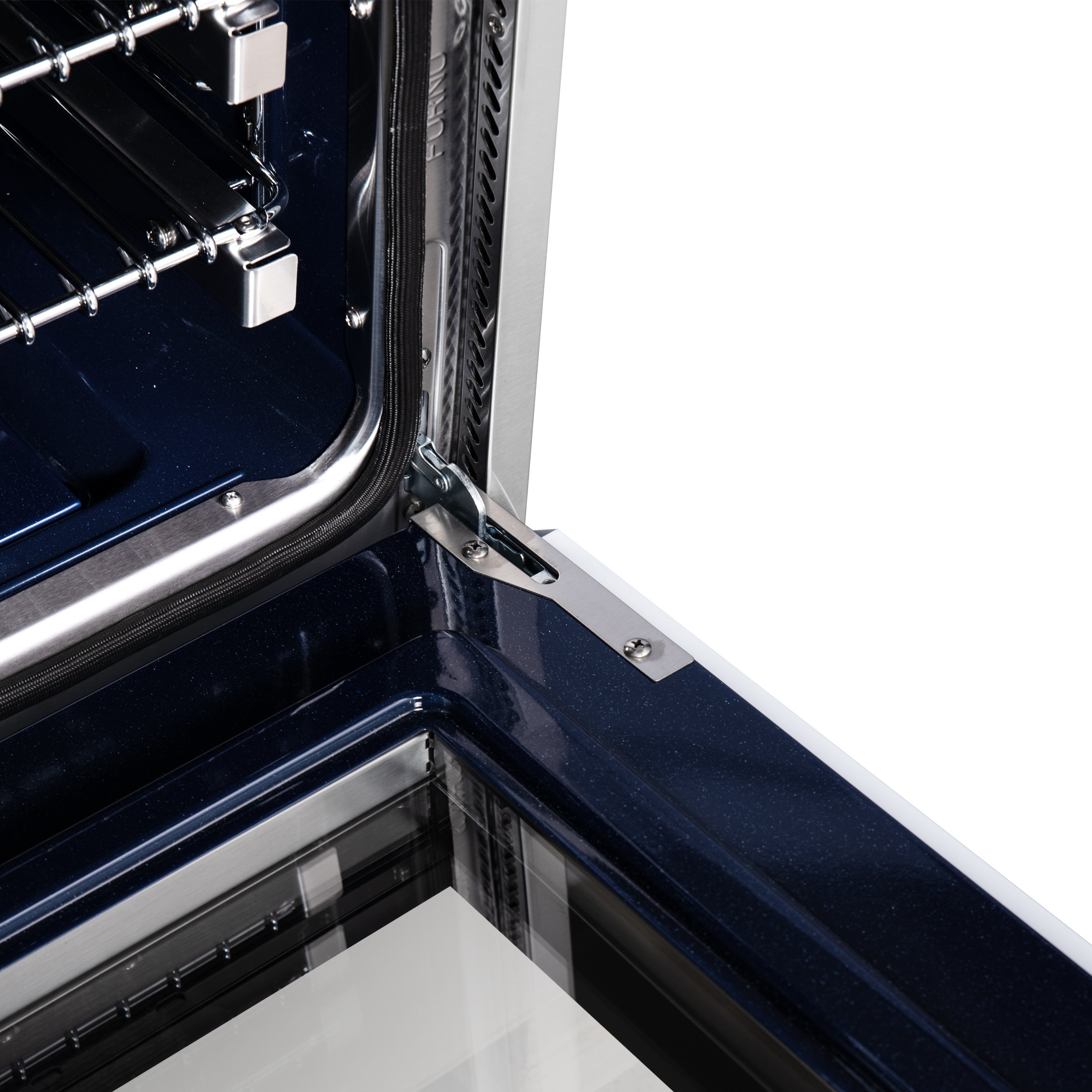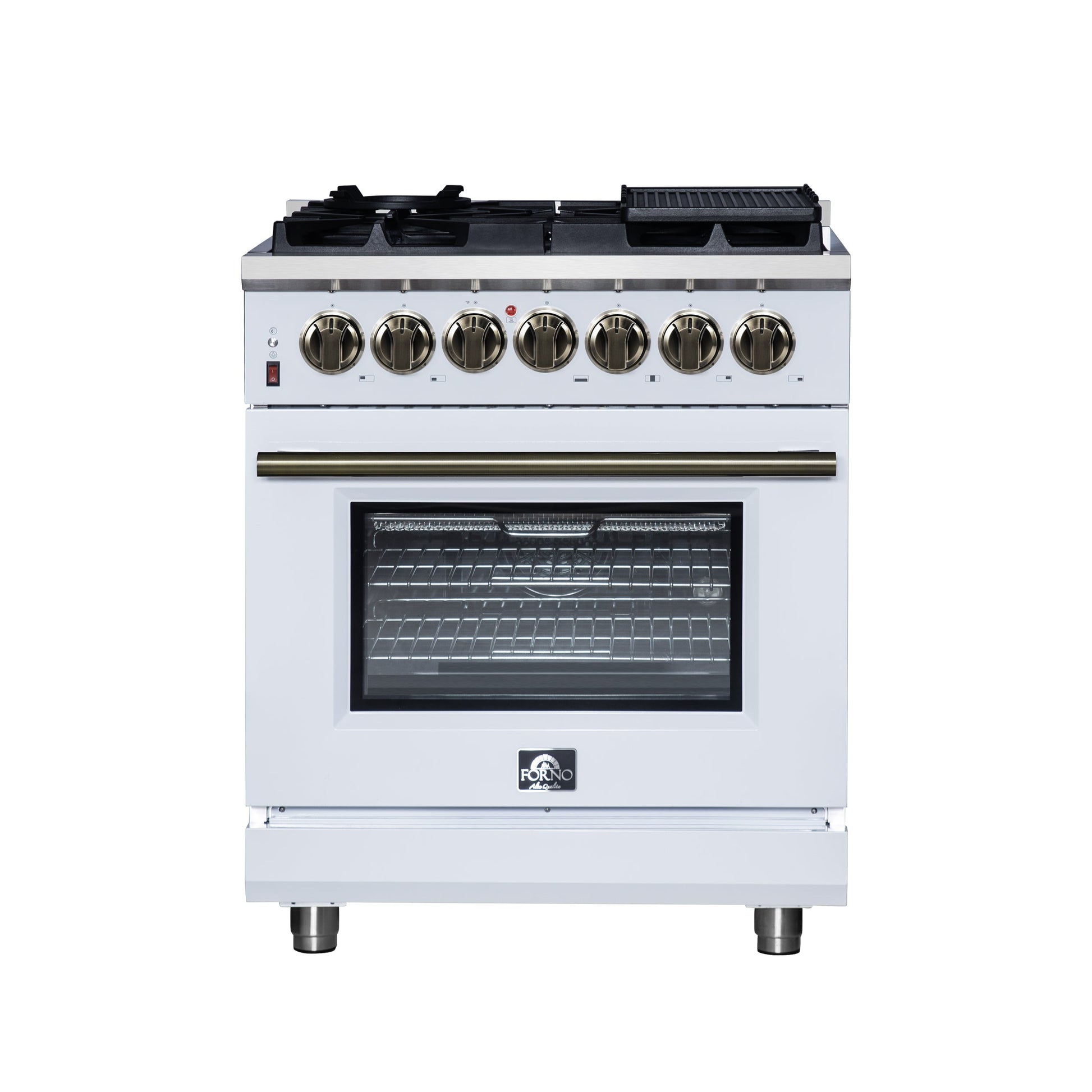 The Massimo 30 Inch Dual Fuel Range in White with Antique Brass Accessories blends professional performance with modern design. The cooktop features 4 powerful sealed gas burners and durable matte cast iron grates, along with a built-in wok ring and removable griddle for flexible cooking. The 4.32 cu. ft. oven offers true convection baking and broiling, low bake, and high bake functions for precise heat control. Equipped with a dual-element broiler, steam-clean interior, and a speckled blue enamel oven cavity, it also includes an air fryer basket for healthier cooking. This freestanding or built-in range is LP convertible and comes with a matching antique brass trim kit.