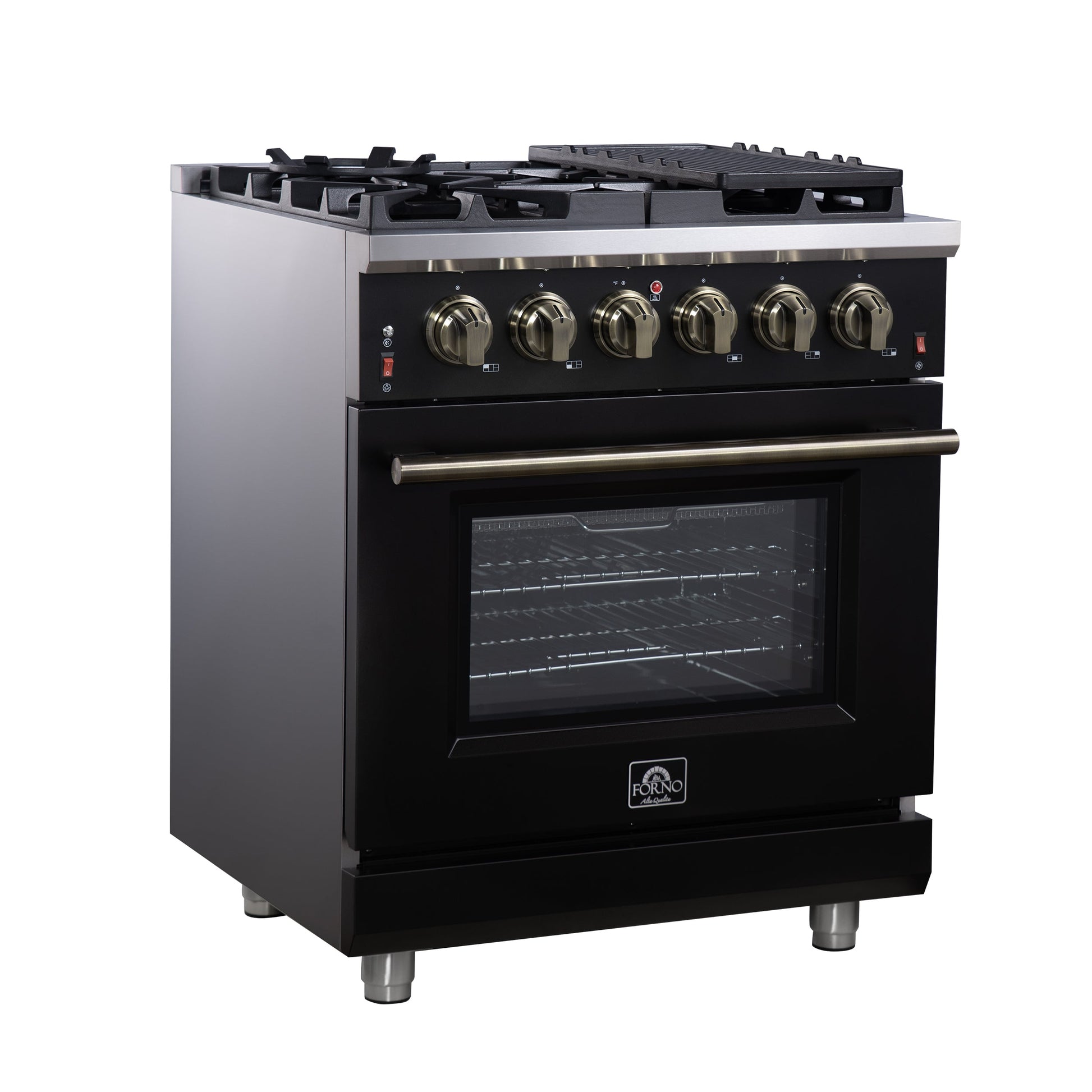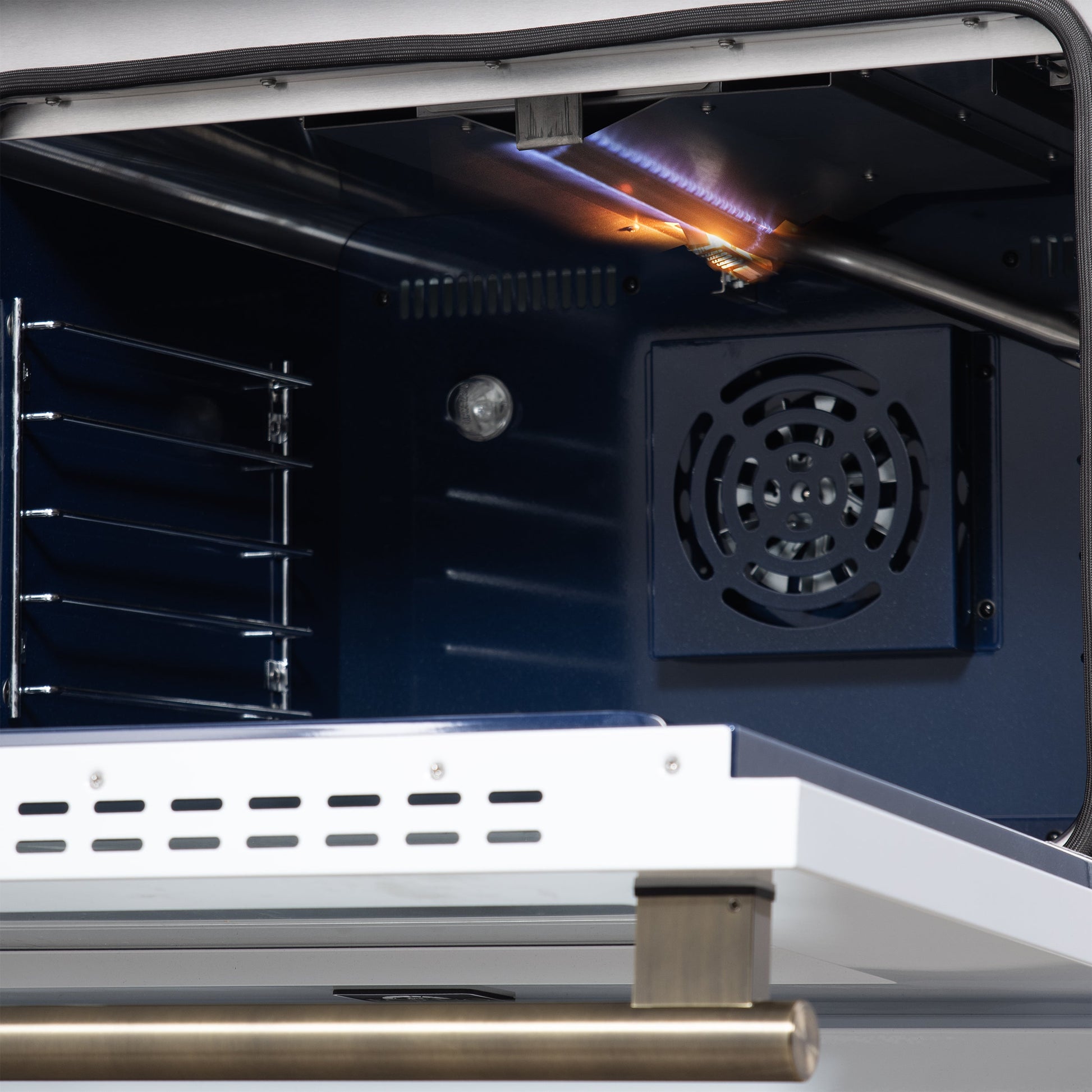 The Forno Massimo 30 Inch Gas Range harmonizes professional style and durability with antique brass. Its 5 sealed burners, totaling 68,000 BTU, include a precision 20,000 BTU dual-ring burner that can simmer at 1,000 BTU. Continuous cast iron grates ensure stability on the enamel surface. The 4.32 cu.ft. convection oven, with a blue enamel interior and 3-layer glass window, reaches 30,000 BTU for versatile cooking. It features 2 telescopic racks, an air fryer kit, a wok support, a reversible griddle, an LP conversion kit, and durable zinc-coated metal knobs. This range delivers performance, convenience, and enduring elegance.