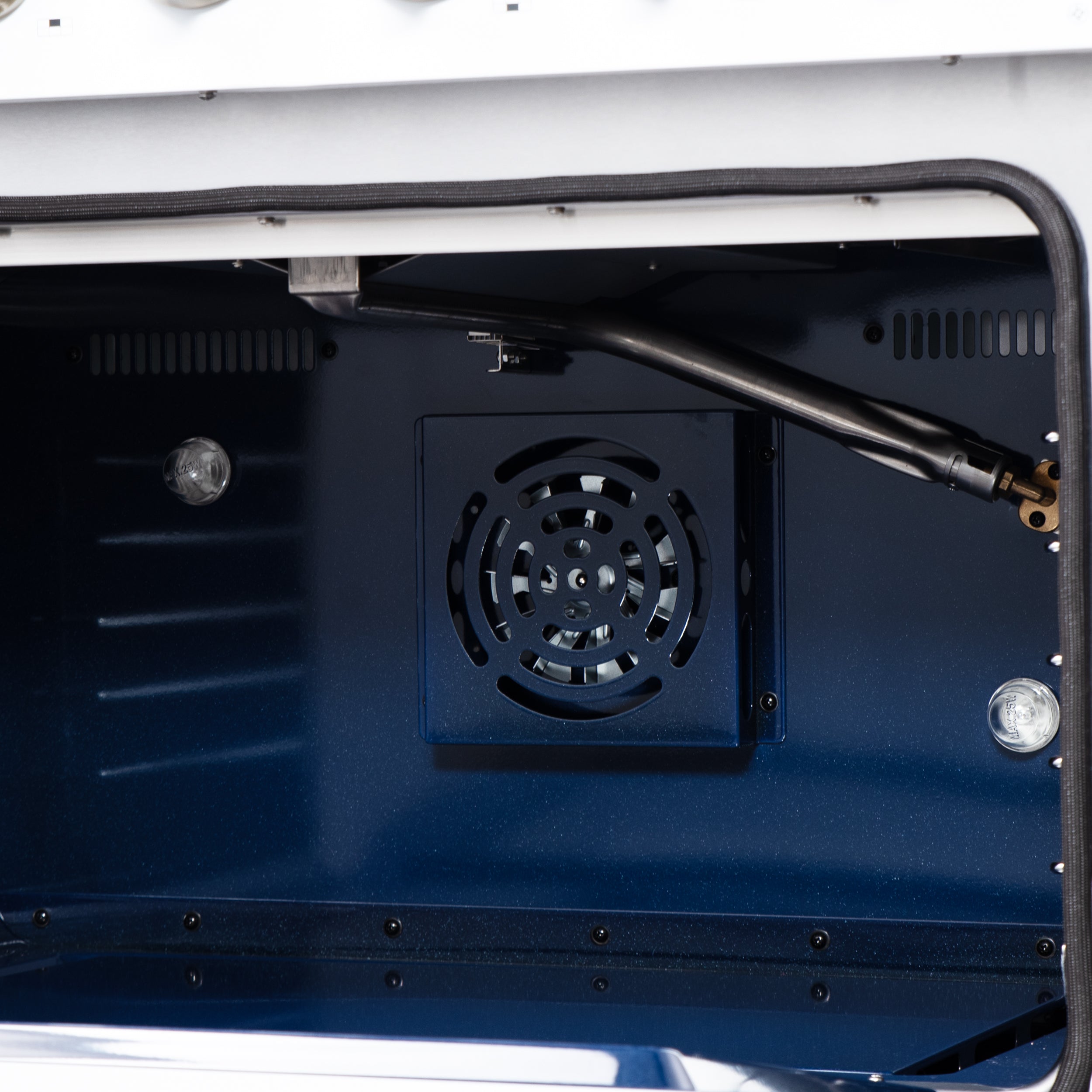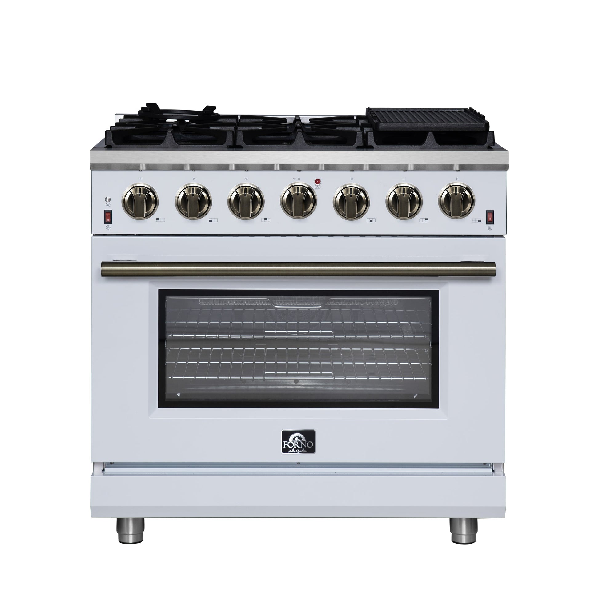 The Forno Massimo 36 Inch Gas Range in White harmonizes professional style and durability with Antique Brass. Its 6 sealed burners, totaling 83,000 BTU, include a precision 20,000 BTU dual-ring burner that can simmer at 1,000 BTU. Continuous cast iron grates ensure stability on the enamel surface. The 5.36 cu.ft. convection oven, with a blue enamel interior and 3-layer glass window, reaches 30,000 BTU for versatile cooking. It features 2 telescopic racks, an air fryer kit, a wok support, a reversible griddle, an LP conversion kit, and durable zinc-coated metal knobs. This range delivers performance, convenience, and enduring elegance.