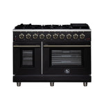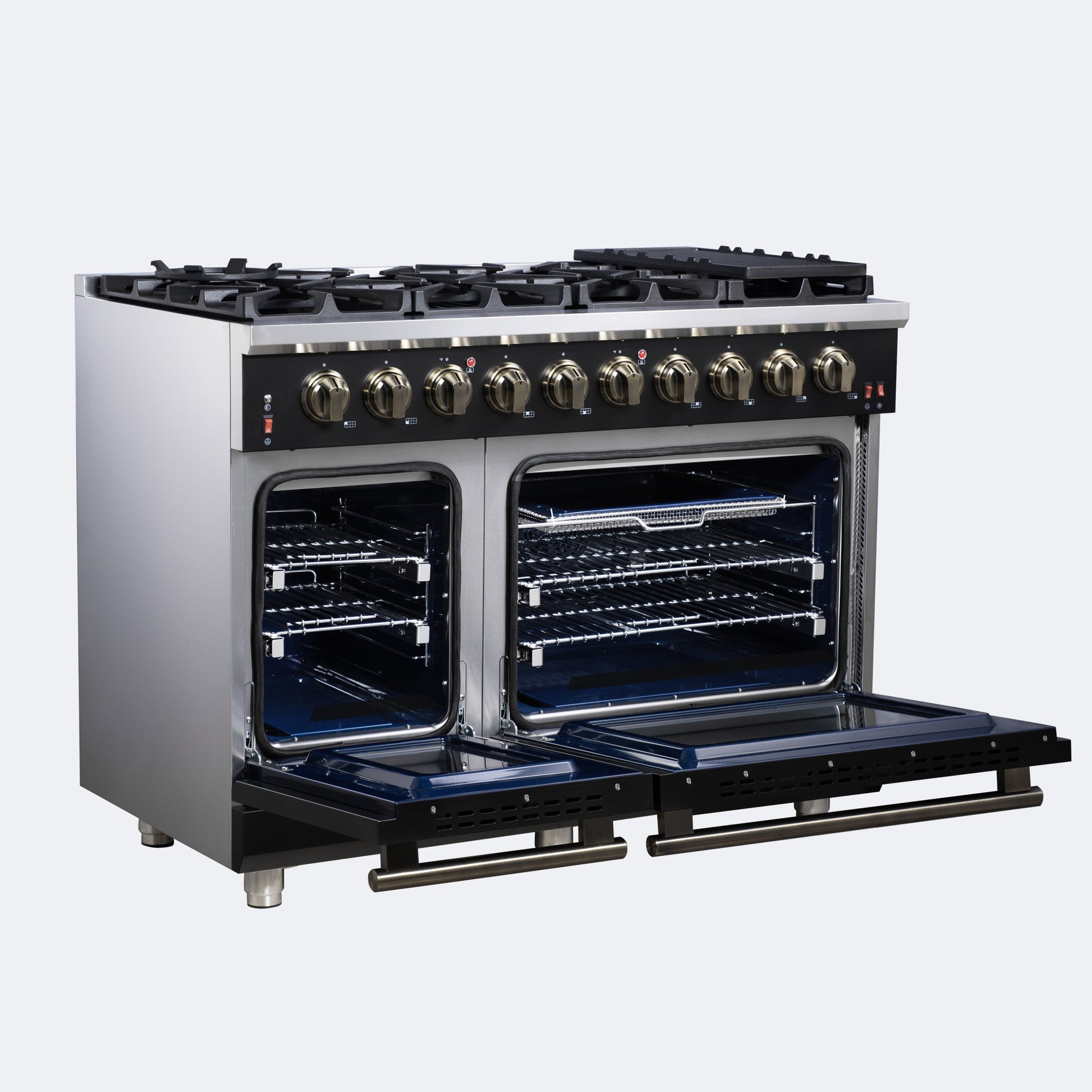 The Forno Massimo 48 Inch Gas Range in Black harmonizes professional style and durability with Antique Brass. Its 8 sealed burners, totaling 107,000 BTU, include a precision 20,000 BTU dual-ring burner that can simmer at 1,000 BTU. Continuous cast iron grates ensure stability on the enamel surface. The main oven of 4.32 cu.ft. has a convection fan with 30,000 BTU total broil and bake output. The secondary oven has a capacity of 2.26 cu.ft. with a 14,000 BTU bake output. Both ovens feature impressive blue enamel interiors for easy cleaning, and 3-layer glass oven door windows provide heat retention and a clear view. It includes 2 telescopic racks per oven, an air fryer kit, a wok support, two reversible griddles, an LP conversion kit, and durable zinc-coated metal knobs. This range delivers performance, convenience, and enduring elegance.