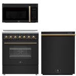 The FORNO Paolo Package offers a stylish and efficient kitchen solution with a 30" electric range, a versatile over-the-range microwave, and a high-performance dishwasher. Finished in sleek black with antique brass accents, this set provides both modern functionality and timeless design for everyday cooking and cleaning needs.