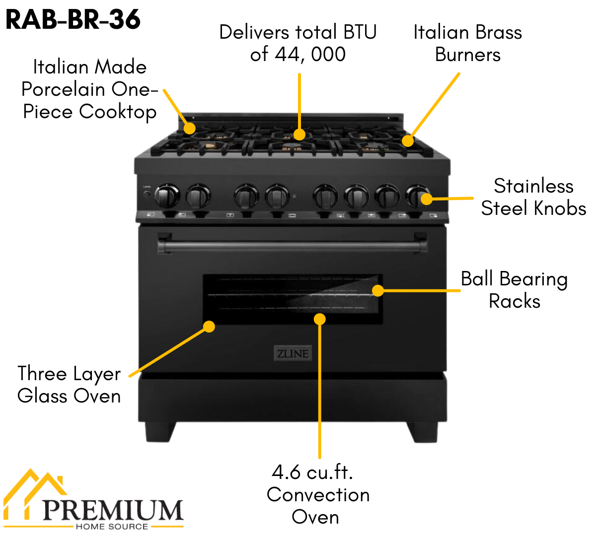 - ZLINE 36 in. Professional Gas Burner/Electric Oven in Black Stainless Steel with Brass Burners, RAB-BR-36