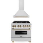 This ZLINE kitchen premium appliance package has a powerful 36 Inch Dual Fuel Range, and Range Hood - all in Stainless Steel with Champagne Bronze Accents.