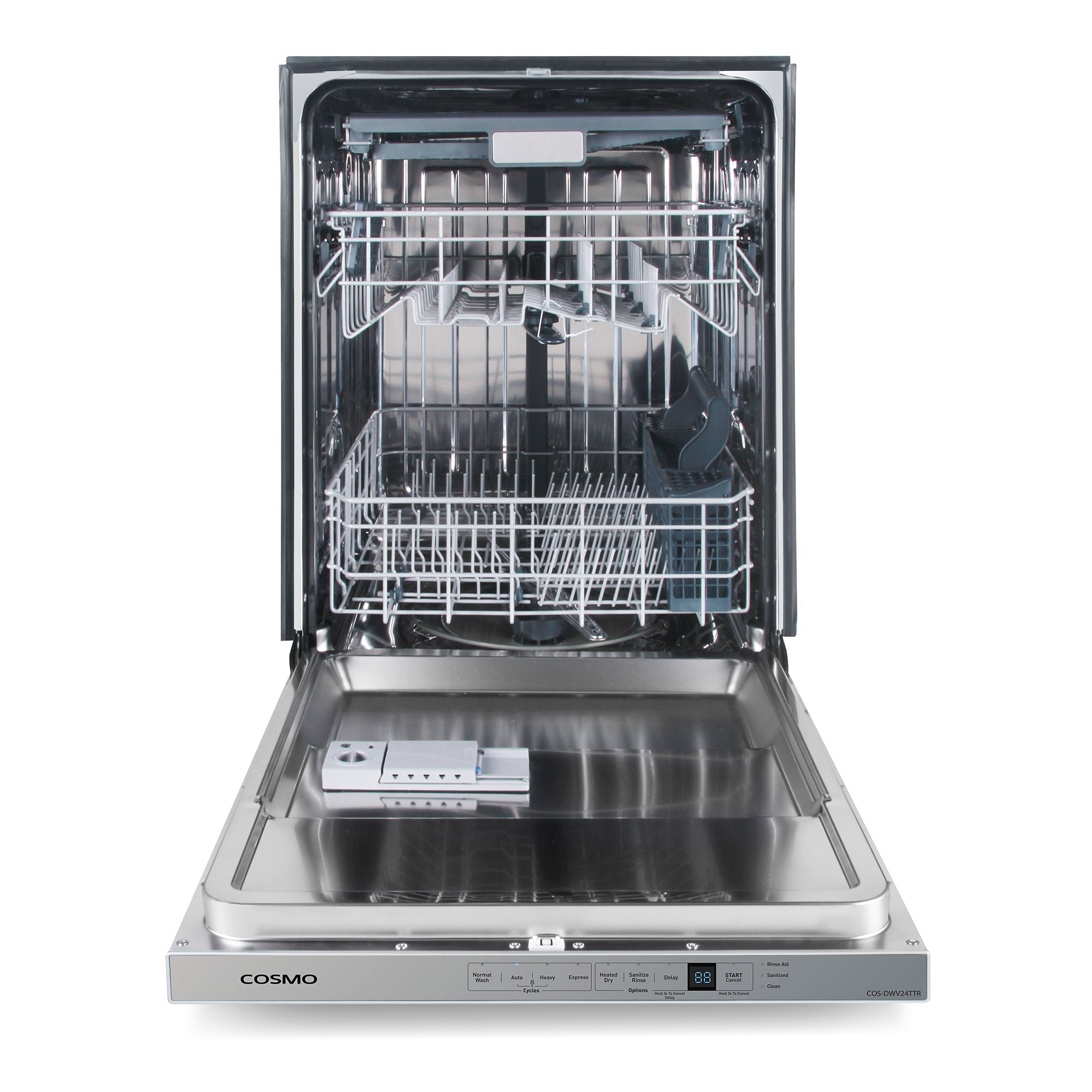 Upgrade your kitchen with the Cosmo Vista 24" Built-in Dishwasher, model COS-DWV24TTR—an elegant and high-performance solution designed for modern living. Part of the Vista Collection, this top-control dishwasher blends sleek design with cutting-edge functionality. With a range of wash cycles, advanced sanitize technology that removes 99.99% of bacteria, and an ultra-quiet 48 dB operation, it delivers both power and peace. The fingerprint-resistant stainless steel finish, hidden soft-touch controls, and spacious interior offer efficiency and elegance. UL and Energy Star certified, this dishwasher is built to handle daily use while saving energy, reducing noise, and enhancing your kitchen's style. Please note: power cord not included.
