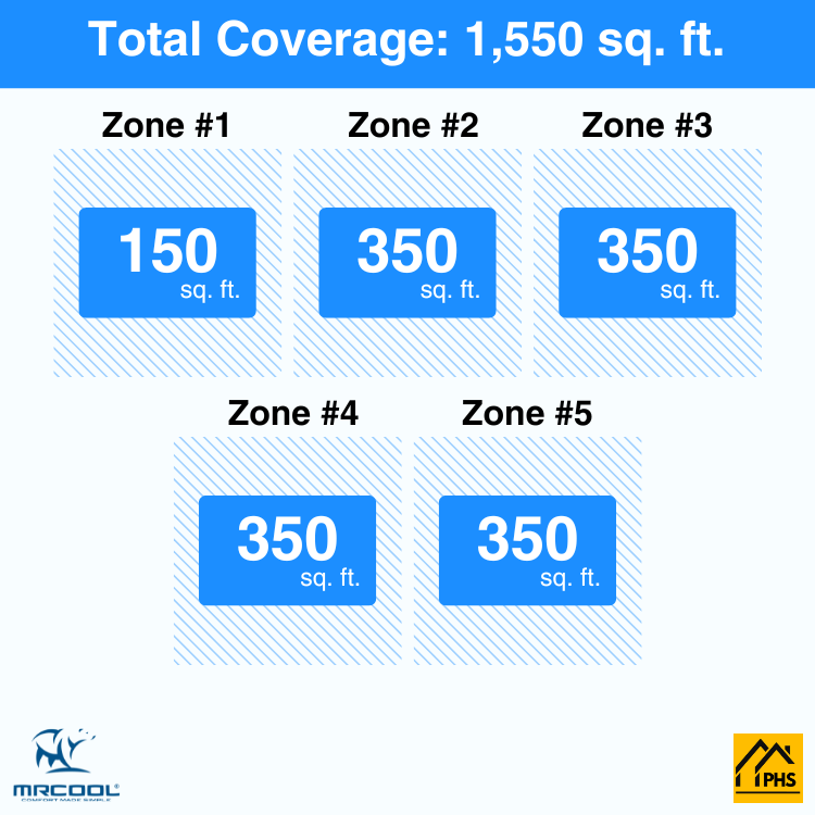 - Five Rooms, Perfect Comfort: Heat or cool five spaces that are 150 sq. ft., 350 sq. ft., 350 sq. ft., 350 sq. ft. and 350 sq. ft. each with independent temperature control for personalized comfort.