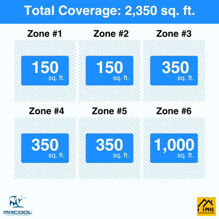 • Six Rooms, Perfect Comfort: Heat or cool six spaces that are 150 sq. ft., 150 sq. ft., 350 sq. ft., 350 sq. ft., 350 sq. ft. and 1,000 sq. ft. each with independent temperature control for personalized comfort.