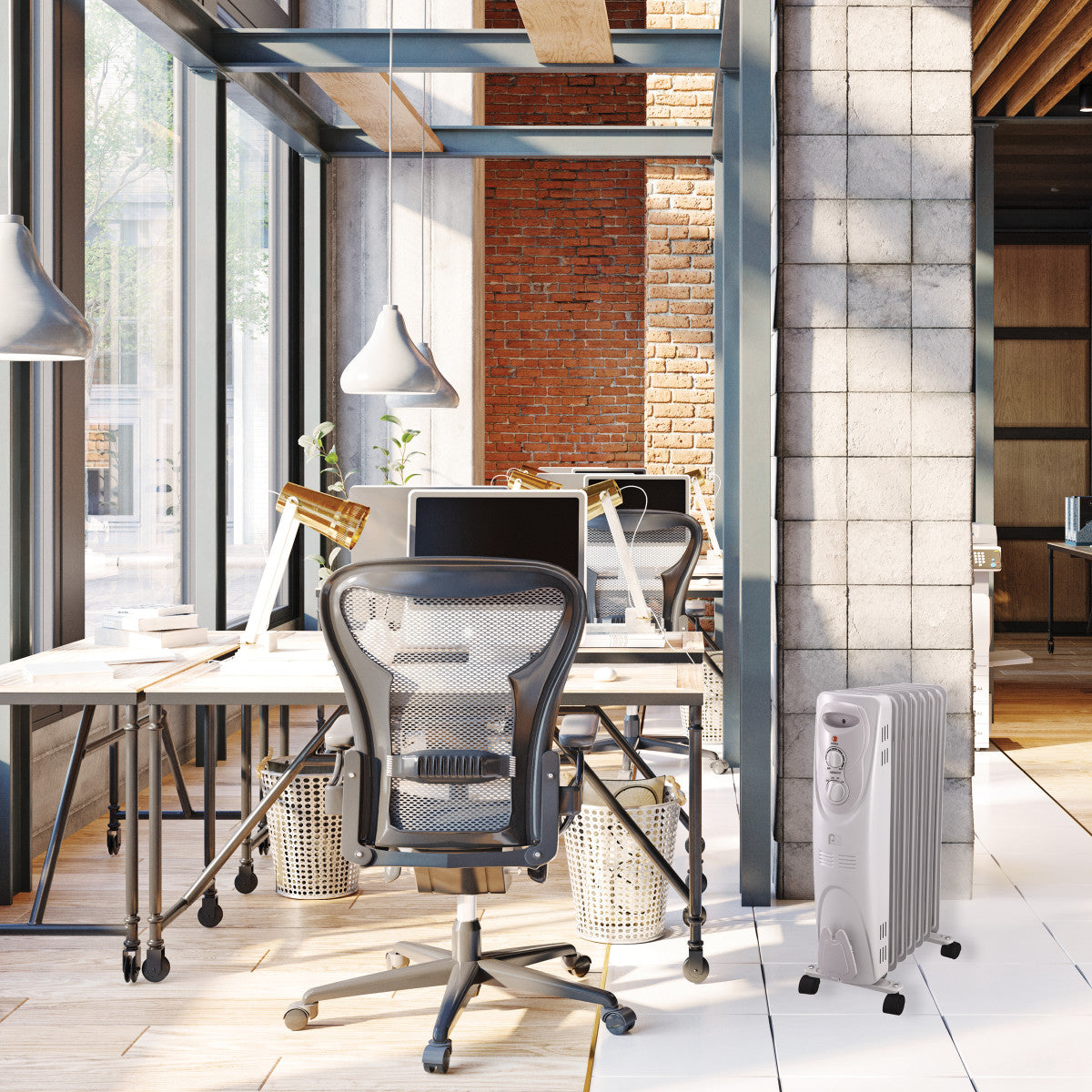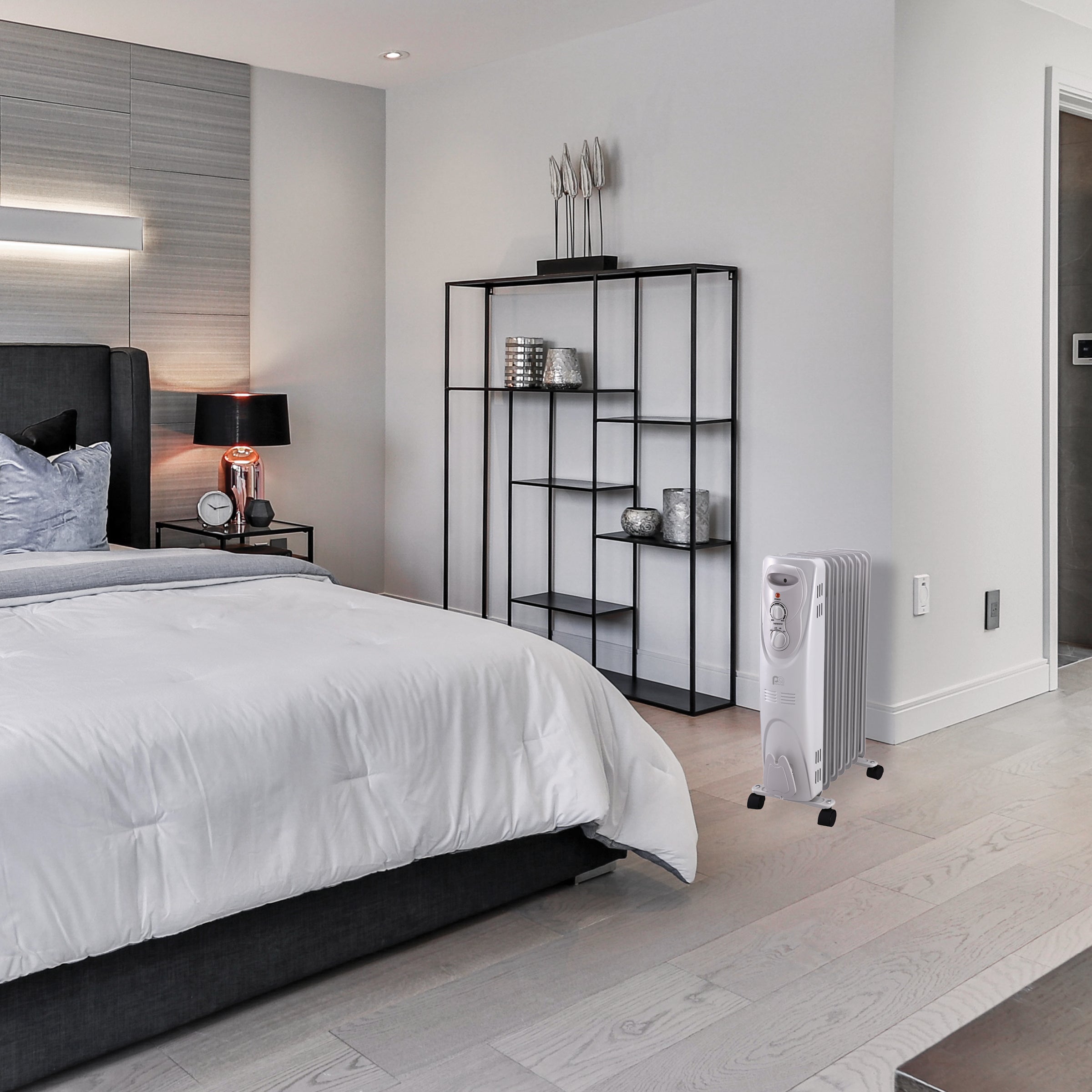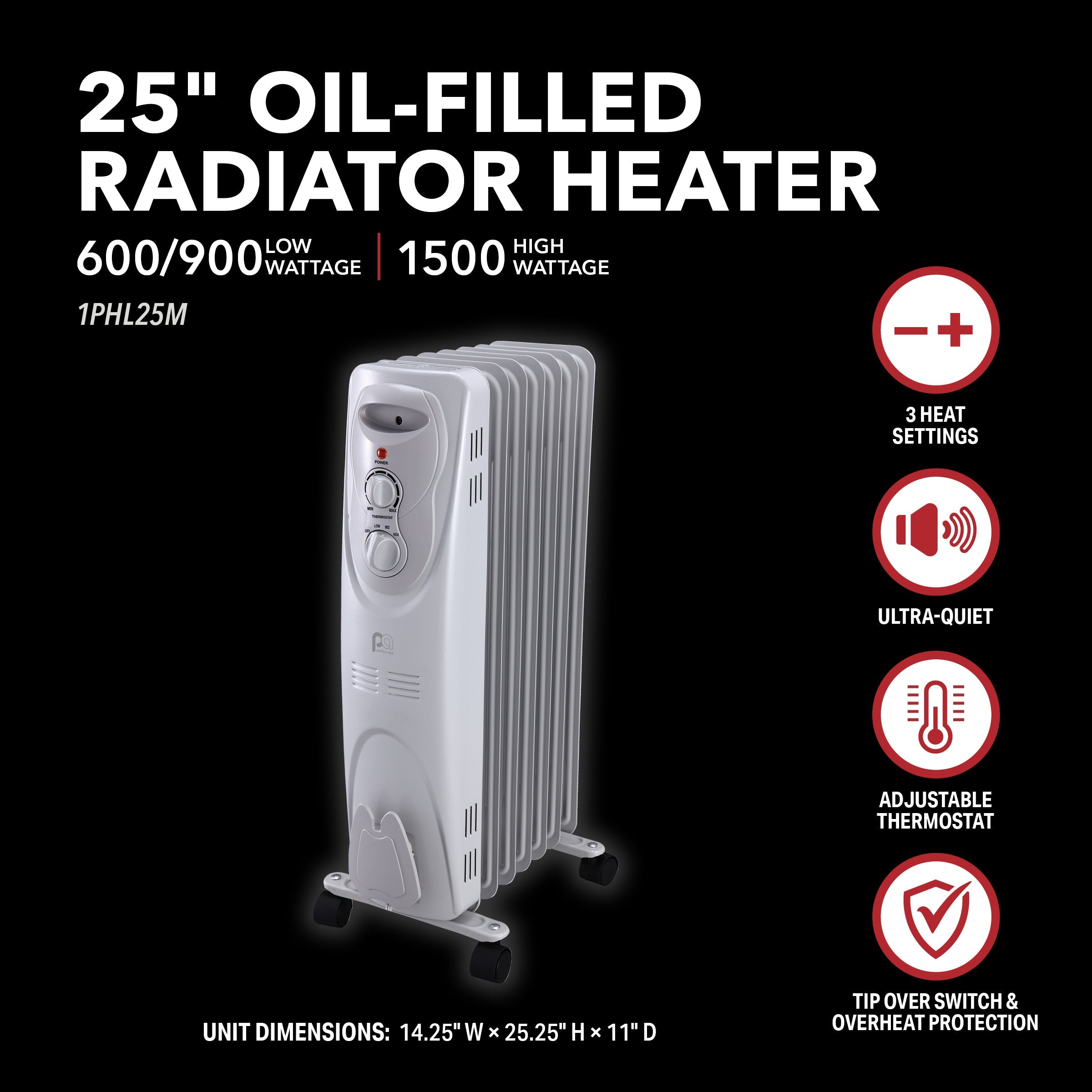 This portable, radiator-style electric heater provides soft, radiant heat so quietly, you won’t even know it’s there. The 7 oil-filled fins use convection to heat your space with 3 heat settings at 1500, 900, and 600 watts. This heater is built for convenience with easy-to use mechanical controls, built-in cord storage, recessed handle, and heavy-duty casters to move the heat where it’s needed most. Oil-filled radiators heat more consistently than other styles of heaters and give off residual heat even after the unit is shut off, so your space cools down gently without a harsh transition from hot to cold. With no exposed heating elements they’re a smart choice for families with small children, and the tip-over protection adds an extra layer of safety so you can enjoy a warm home and peace of mind.