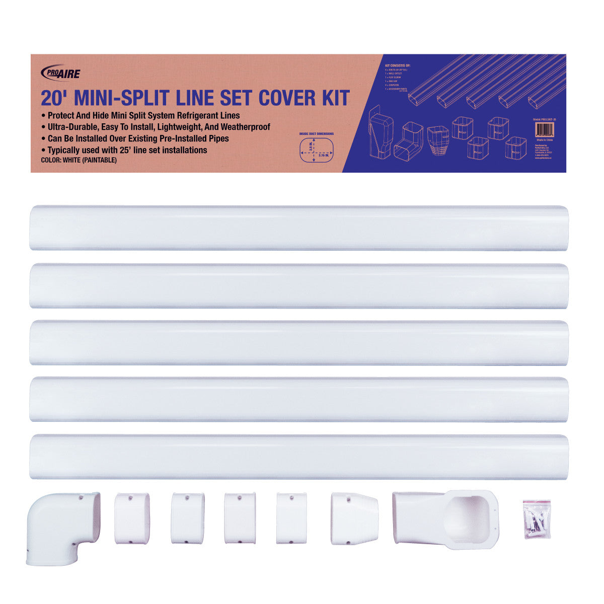 Hide those unsightly mini-split line sets with this Line Set Cover Kit from ProAire! This kit protects and hides mini-split refrigeration line installations up to 15’, and can be installed over existing pre-installed pipes. The ultra-durable material is easy to install, lightweight, weatherproof, and can be painted to match your home’s exterior. 12’ kit includes: (3) 47.25” ducts, (1) end cap, (1) wall outlet, (2) couplers, (1) flat elbow, and (1) accessory part. This can also be combined with individually sold line set cover pieces to customize your installation.