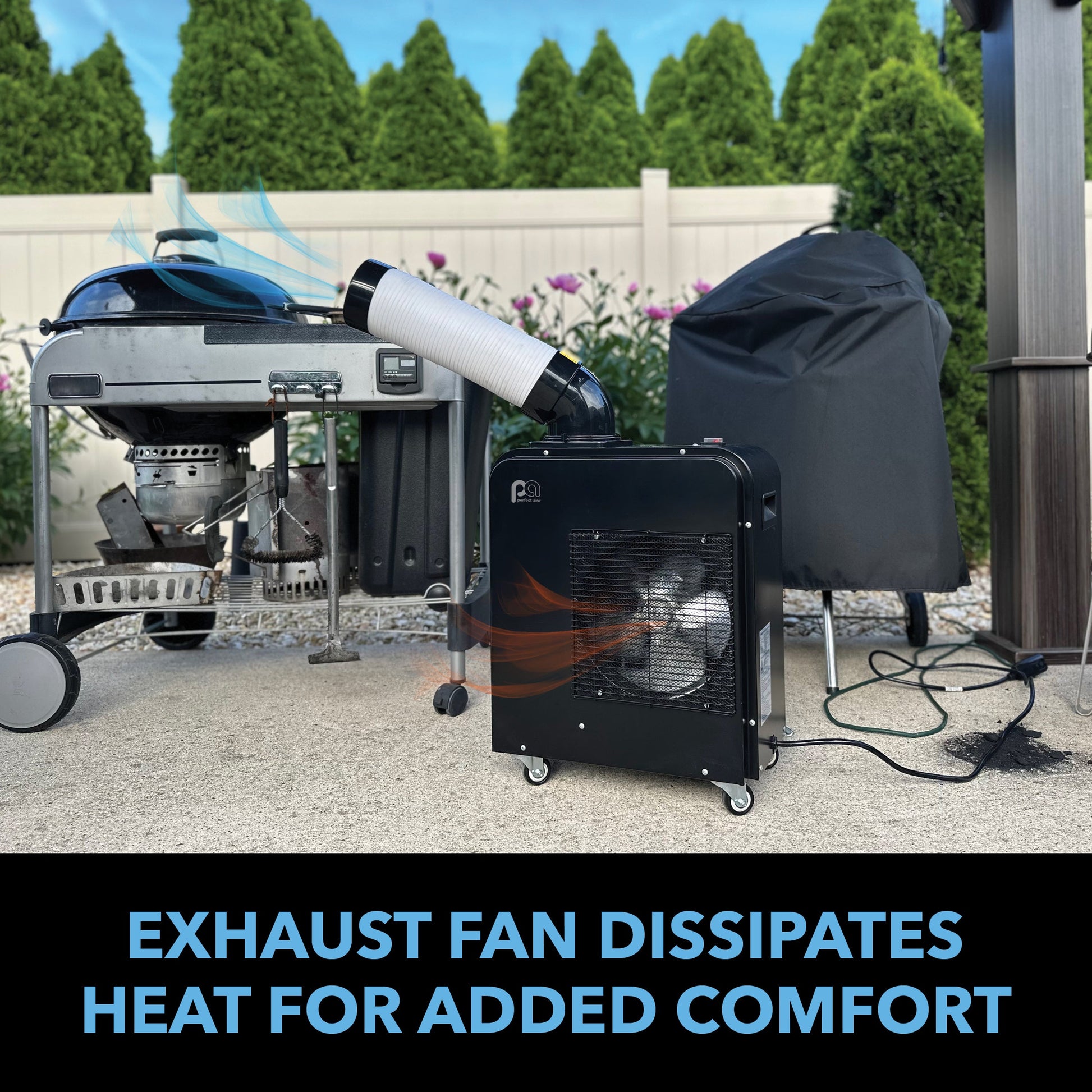 The Perfect Aire 7,000 BTU Portable Spot Cooler provides instant cooling to enhance your comfort and productivity, ideal for patios or decks, workshops, construction sites, woodworking shops, garages, and farms! Perfect for hot summer days with operation up to 109°F, the air conditioner works to reduce humidity and heat with the powerful internal exhaust fan. The 360-degree spinner wheels and adjustable blower allows the air conditioner to easily roll wherever needed throughout your space and to direct the cooling in whichever direction needed for easy portability and convenience. With 2 options for drainage, including an easy empty bucket and continuous drainage with a hose (included), the Spot Cooler was designed for ease. No installation required- just plug in and enjoy the cool air!