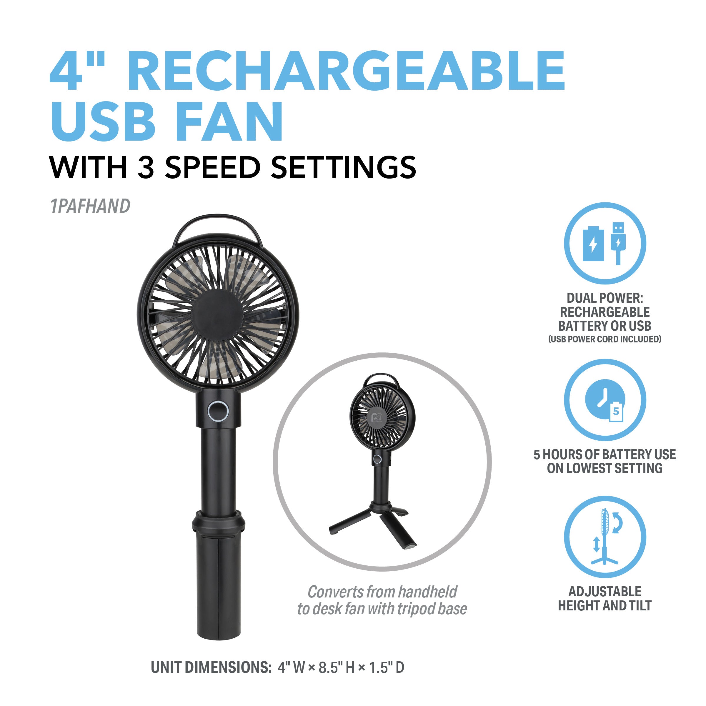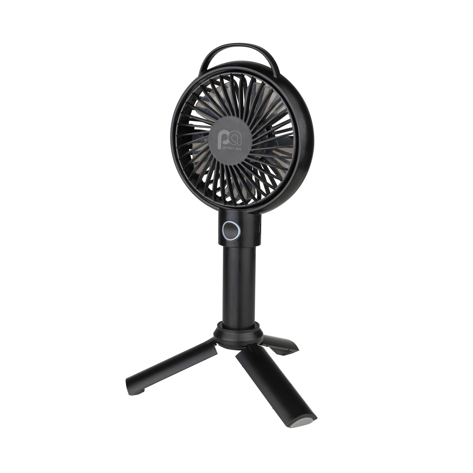Stay cool on the go with this 4” rechargeable USB fan from Perfect Aire. The built-in tripod base means you get the best of both worlds - use the tripod to set the fan on a flat surface, or fold it up and carry the wind in your hand! Power your fan with the included USB cord, or go cordless for up to 5 hours of use with the rechargeable battery. Direct the air flow with the adjustable height and tilting head, and choose your comfort level from the three fan speeds. Quiet and compact, this fan is ready to go anywhere the wind may take you.