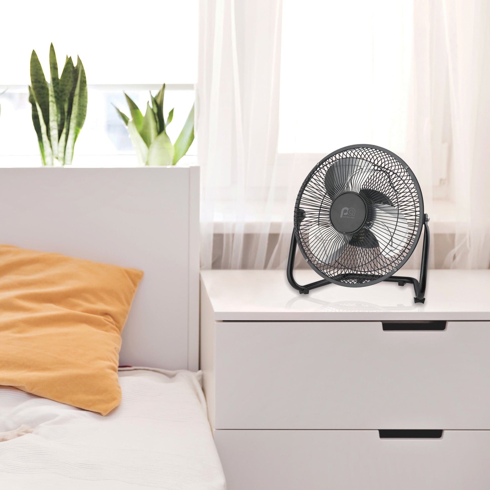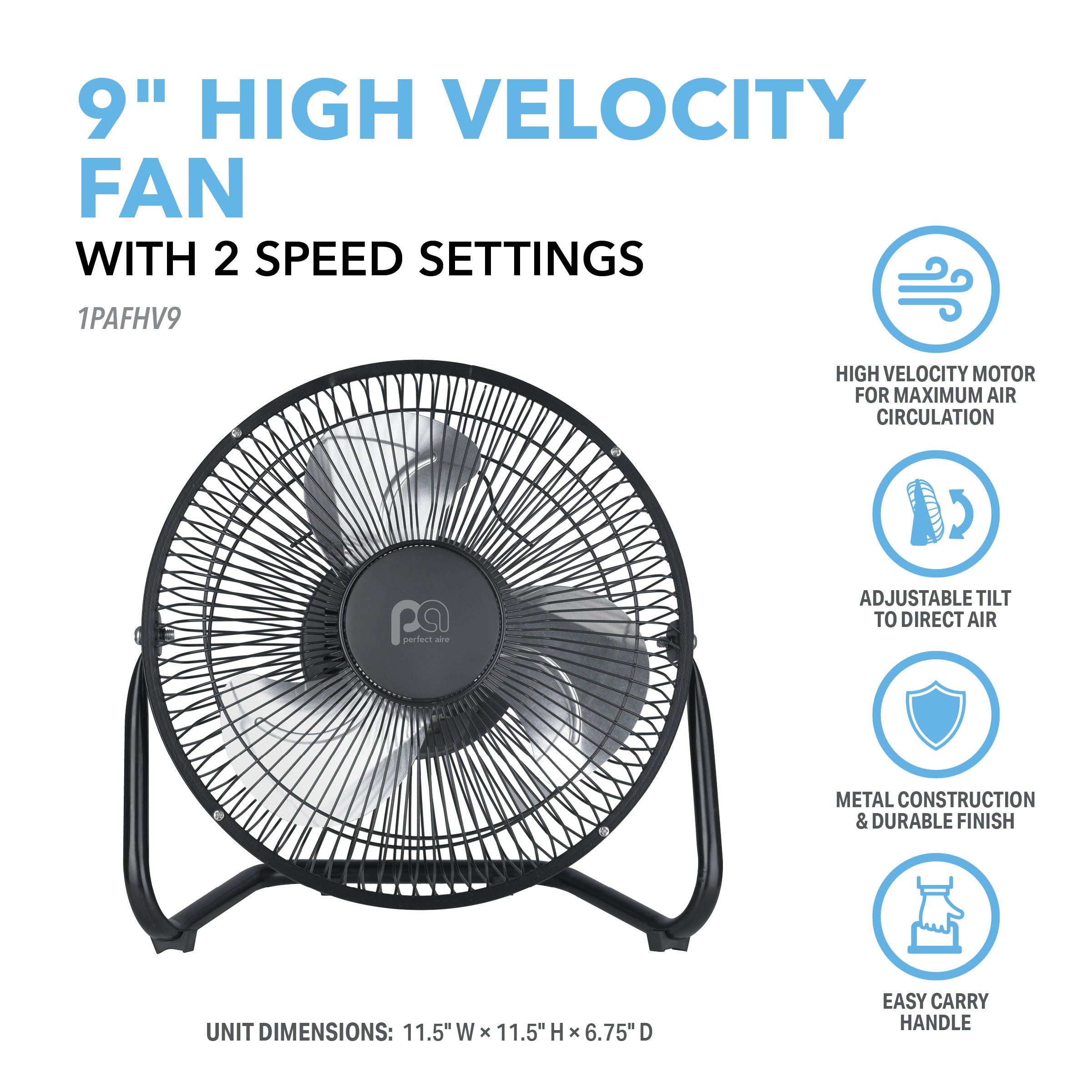 Bedroom feeling stuffy? Let the fresh air in with this Perfect Aire 9” high velocity fan. Built to last, this fan has 9” diameter aluminum fan blades, metal construction, and a durable finish. Use the adjustable tilting head to direct air where you need it, while two speed settings let you choose the right amount of air for your comfort. The easy carry handle means you aren’t stuck in one space, so use this fan in your living room, bedroom, garage, or wherever else you need a blast of fresh air.