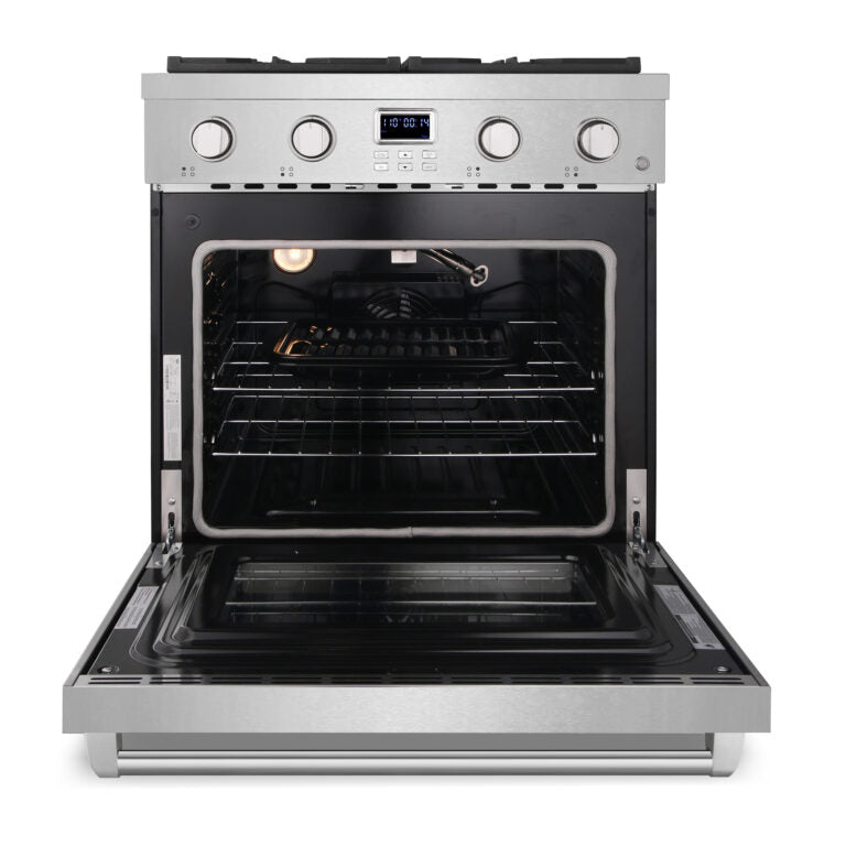 Enhance your kitchen with the sophisticated design and high performance of the Cosmo Lumin 30" Gas Range. Combining professional-grade features with modern elegance, this range boasts four sealed burners for precise heat control and flexibility - from quick boiling to gentle simmering. The spacious 4.8 cu. ft. convection oven ensures an even and consistent cooking experience with the use of a built-in fan and multiple cooking modes for every type of recipe. Constructed with heavy-duty cast iron grates and a sturdy stainless steel exterior, the COS-GRC304KB offers reliability, style, and enhanced functionality. As part of the Cosmo Lumin Collection, this gas range is perfect for home chefs seeking convenience, versatility, and bold design.