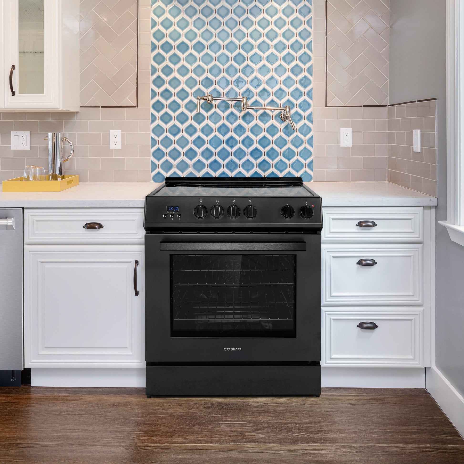 Enhance the sophistication and reliable performance of your kitchen with the Cosmo Stellar 30" Electric Range in Matte Black. Featuring a sleek design and practical features, this high-end appliance is a valuable addition to any household. The spacious 5.0 cu. ft. convection oven provides fast and even cooking, while the smooth black glass cooktop includes four burners, two of which have dual elements for versatility in cookware size. With digital controls, six oven functions, and safety measures, the COS-ERD304K-BK is equipped to handle daily meals and special occasions with ease. Its modern, matte black finish adds a bold and contemporary touch to any kitchen.