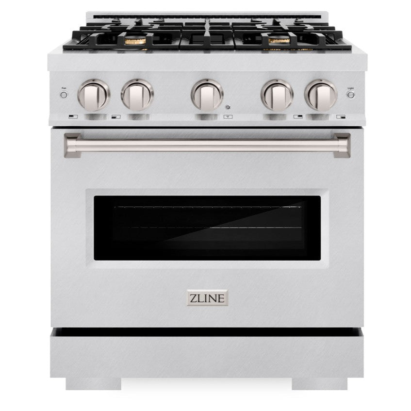 Luxury isn’t meant to be left desired—it’s meant to be attainable. The ZLINE 30 in. 4.2 cu. ft. Classic Dual Fuel Range with Gas Cooktop and Electric Convection Oven in Satin Stainless Steel with 4 Brass Burners (CDRS-BR-30) combines the elegance of a hand-finished porcelain gas cooktop with 4 Italian-made brass auto-reignition burners, an electric convection oven with an energy-efficient cooling fan to ensure quiet operation, and a Landscape oven door window design allowing you to master every meal. With a modern, timeless style and refined functionality, ZLINE Classic Dual Fuel Ranges are masterfully crafted to deliver an elevated culinary experience.