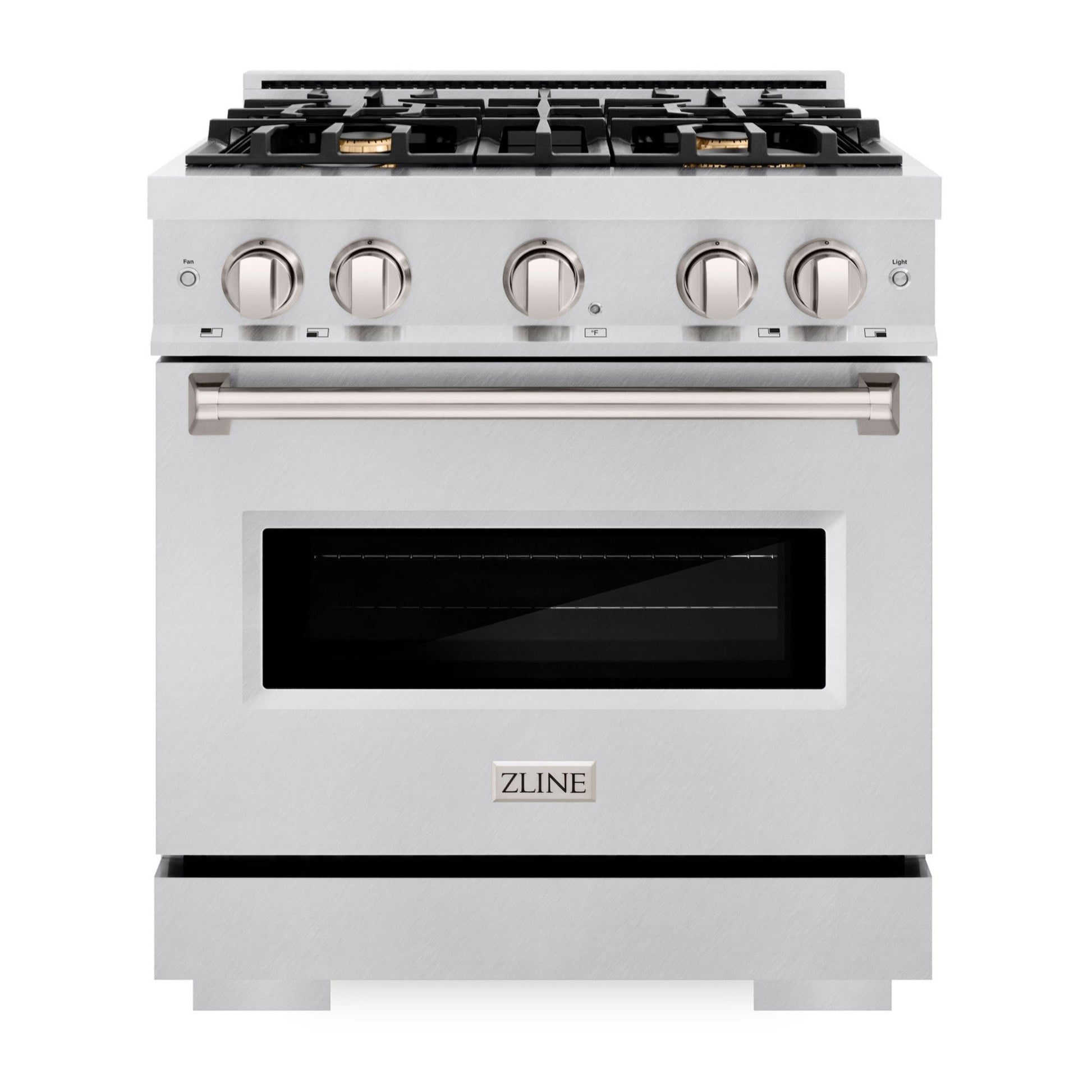 Luxury isn’t meant to be left desired—it’s meant to be attainable. The ZLINE 30 in. 4.2 cu. ft. Classic Gas Range with Convection Gas Oven in Satin Stainless Steel with 4 Brass Burners (CGRS-BR-30) combines the elegance of a hand-finished porcelain gas cooktop with 4 Italian-made brass auto-reignition burners, a gas convection oven with an energy-efficient cooling fan to ensure quiet operation, and a Landscape oven door window design allowing you to master every meal. With a modern, timeless style and refined functionality, ZLINE Classic Gas Ranges are masterfully crafted to deliver an elevated culinary experience.