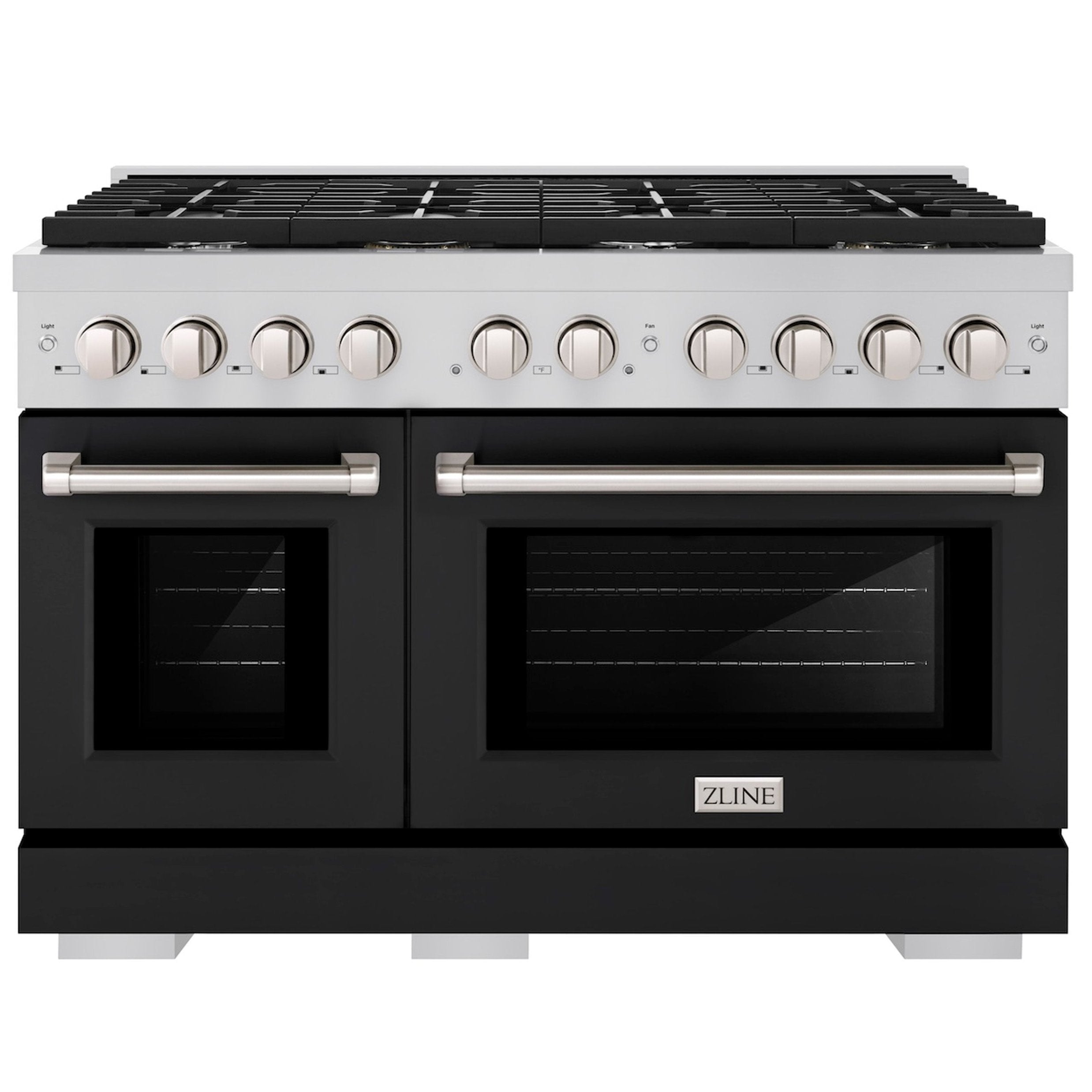 Luxury isn't meant to be desired - it's meant to be attainable. The ZLINE 48 in. 6.7 cu. ft. Paramount Double Oven Dual Fuel Range with 8 Burner Gas Cooktop in Stainless Steel with Black Matte Doors (SDR-BLM-48) combines the versatility of a gas cooktop with 8 Italian-made auto-reignition burners, a large high-performing electric convection oven and a small bake-and-broil oven with digital thermostat technology, enhanced cast iron grates, and beautiful black matte doors with Horizon window designs allowing you to master every meal. With a modern, timeless style and refined functionality, ZLINE Paramount Dual Fuel Ranges are masterfully crafted to deliver an elevated culinary experience.
