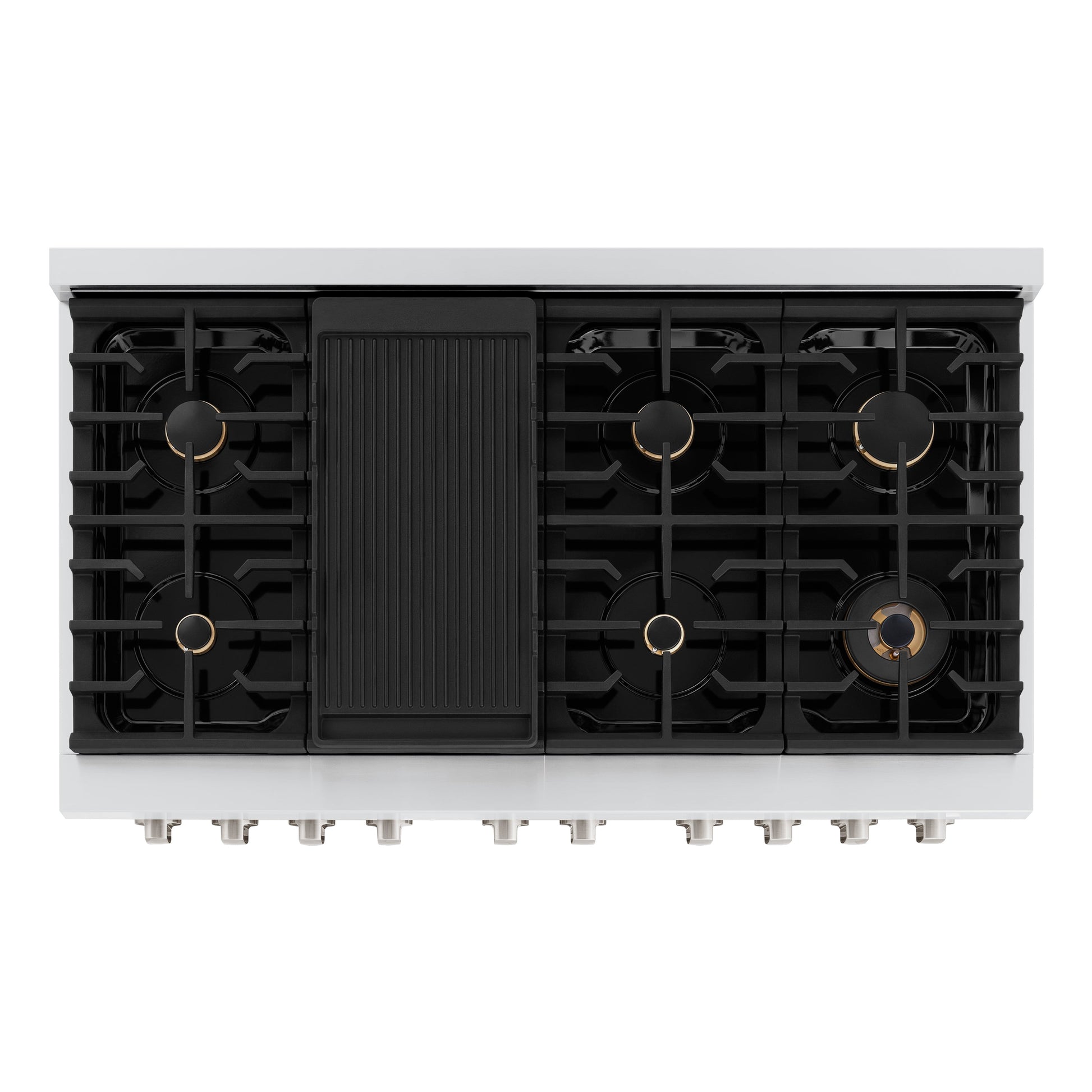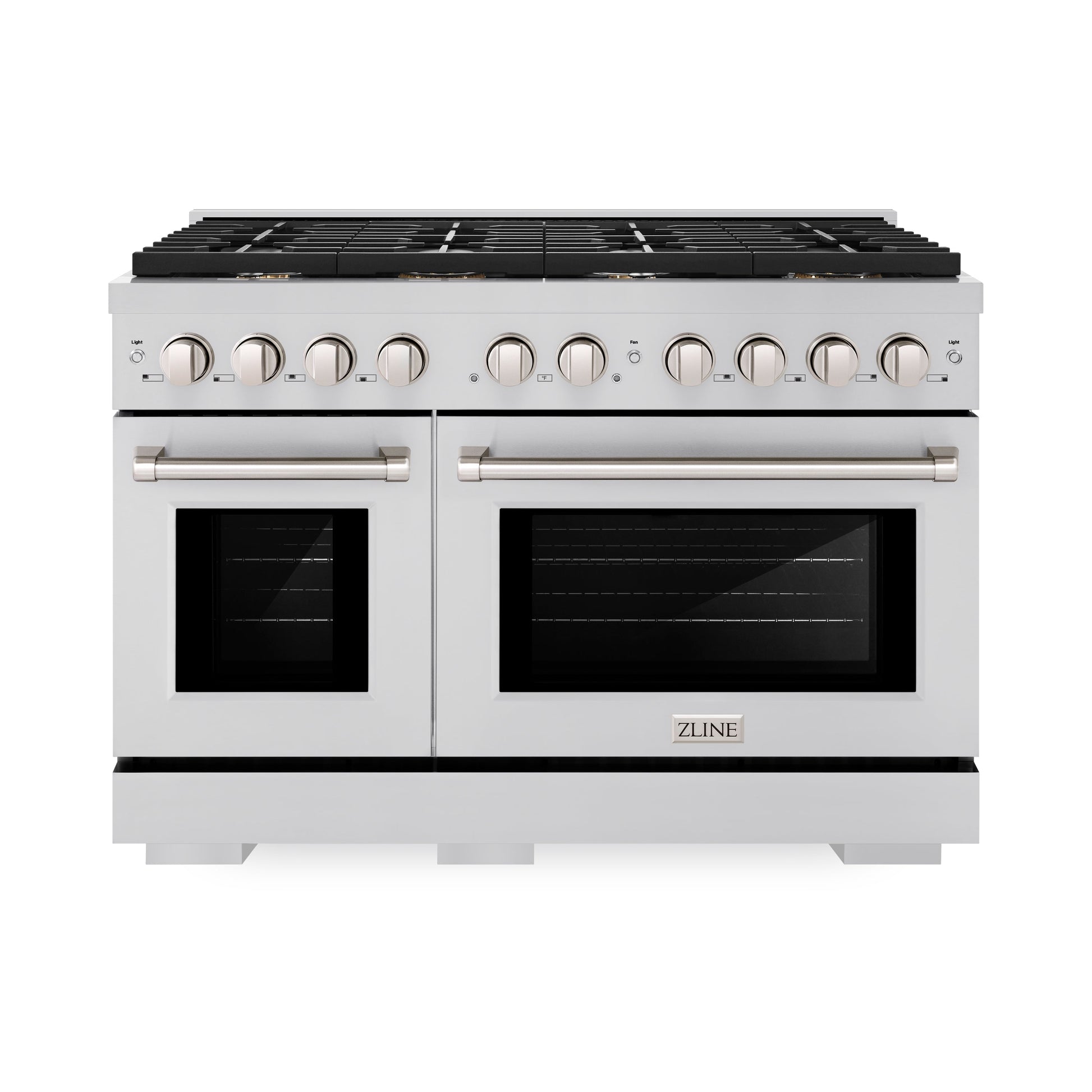 Luxury isn't meant to be desired - it's meant to be attainable. The ZLINE 48 in. 6.7 cu. ft. Paramount Double Oven Gas Range in Stainless Steel with 8 Brass Burners (SGR-BR-48) features a versatile gas cooktop with 8 Italian-made sealed brass burners, a large high-performing gas convection oven, a small baking oven, enhanced cast iron grates, and Horizon oven door window designs allowing you to master every meal. With a modern, timeless style and refined functionality, ZLINE Paramount Gas Ranges are masterfully crafted to deliver an elevated culinary experience.