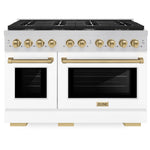 Luxury isn't meant to be desired - it's meant to be attainable. The ZLINE Autograph Edition 48 in. 6.7 cu. ft. Paramount Double Oven Gas Range with 8 Burner Cooktop in Stainless Steel with White Matte Doors and Champagne Bronze Accents (SGRZ-WM-48-CB) features a versatile gas cooktop with 8 Italian-made auto-reignition burners, a large high-performing gas convection oven, a small baking oven, enhanced cast iron grates, beautiful white matte doors with Horizon window designs, and elegant champagne bronze knobs and handles allowing you to master every meal. With a modern, timeless style and refined functionality, ZLINE Paramount Gas Ranges are masterfully crafted to deliver an elevated culinary experience.