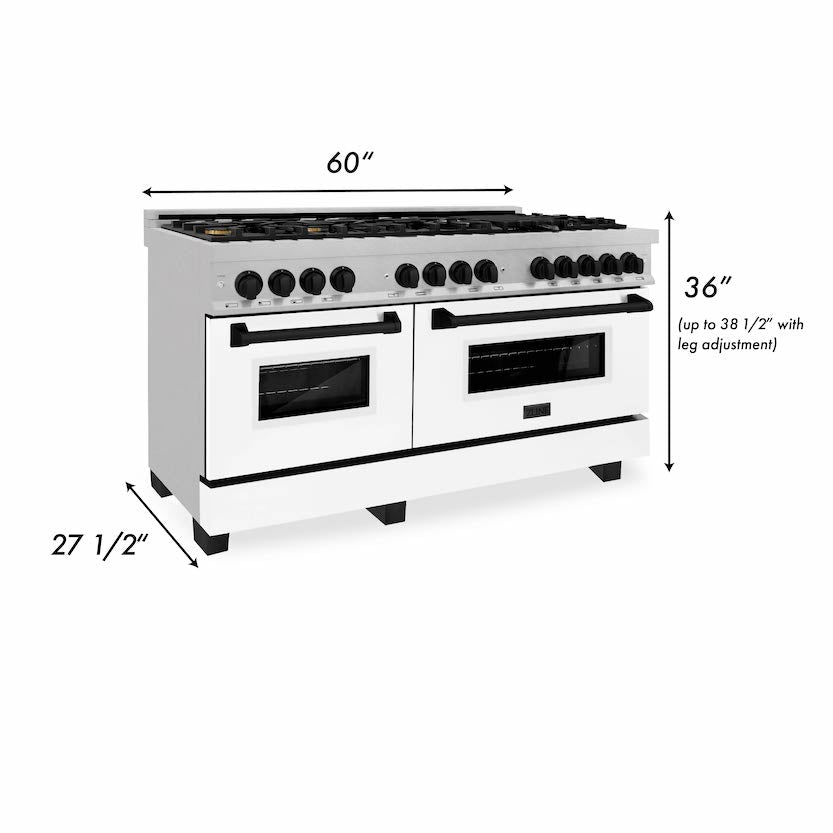 Luxury isn’t meant to be left desired—it’s meant to be attainable. The ZLINE Autograph Edition 60 in. 7.4 cu. ft. Legacy Dual Fuel Range with 9 Burner Gas Cooktop and 2 Electric Convection Ovens in Satin Stainless Steel with White Matte Doors and Matte Black Accents (RASZ-WM-60-MB) pairs a powerful gas cooktop with 9 Italian-crafted burners, dual electric convection ovens, beautiful white matte doors with Landscape window designs, and elegant matte black knobs and handles. With innovative features designed to enhance your kitchen’s capability, ZLINE Legacy Dual Fuel Ranges provide a professional culinary experience by pairing unmatched performance with timeless style.