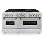 Luxury isn’t meant to be left desired—it’s meant to be attainable. The ZLINE Autograph Edition 60 in. 7.4 cu. ft. Legacy Dual Fuel Range with 9 Burner Gas Cooktop and 2 Electric Convection Ovens in Satin Stainless Steel and Polished Gold Accents (RASZ-SN-60-G) pairs a powerful gas cooktop with 9 Italian-crafted burners, dual electric convection ovens with Landscape window designs, and elegant polished gold knobs and handles. With innovative features designed to enhance your kitchen’s capability, ZLINE Legacy Dual Fuel Ranges provide a professional culinary experience by pairing unmatched performance with timeless style.