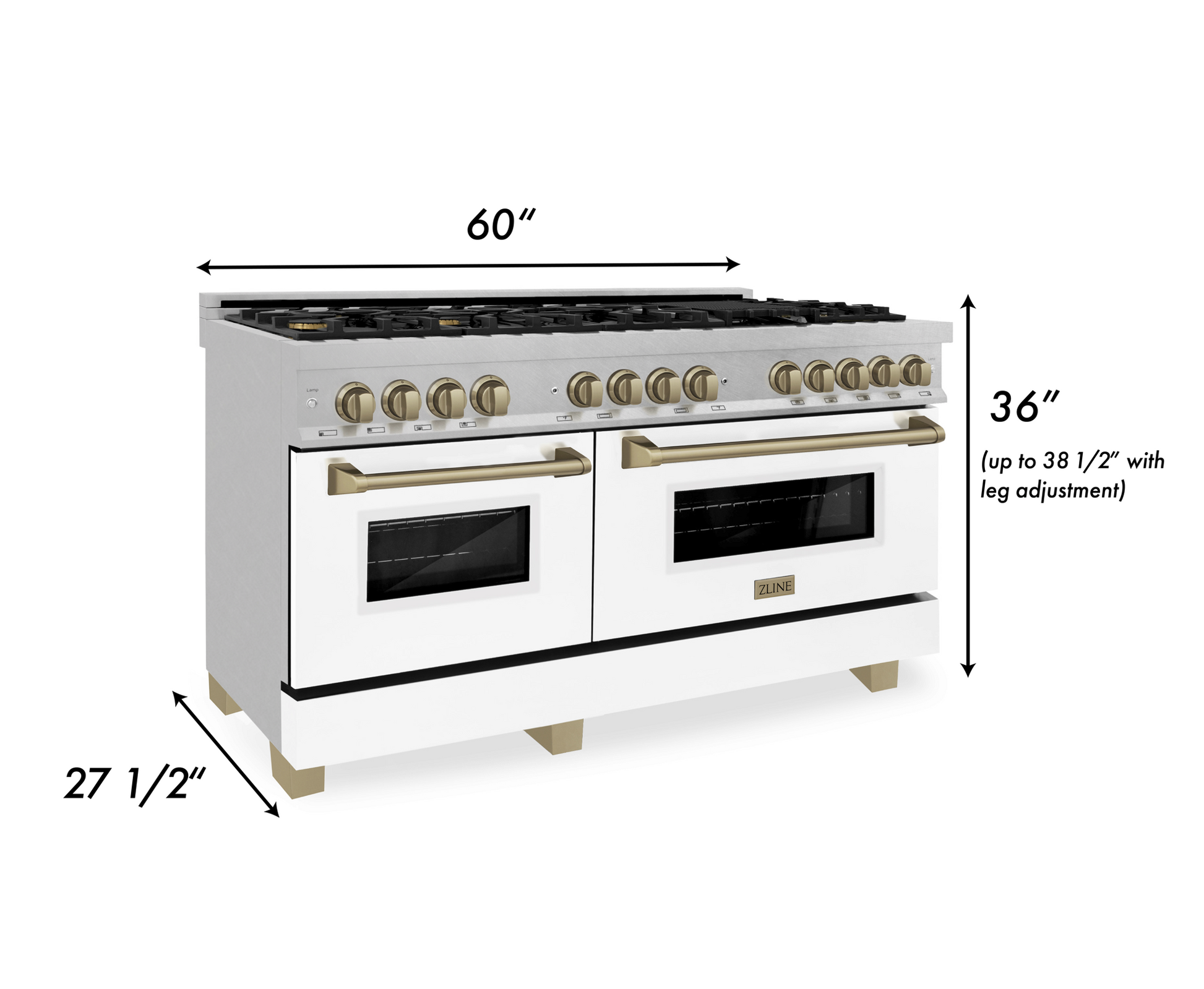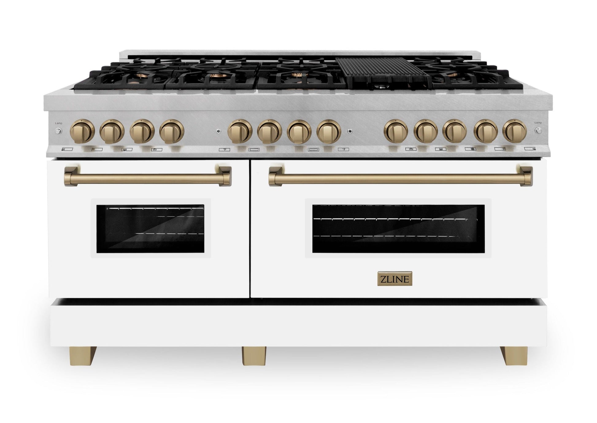 Luxury isn’t meant to be left desired—it’s meant to be attainable. The ZLINE Autograph Edition 60 in. 7.4 cu. ft. Legacy Dual Fuel Range with 9 Burner Gas Cooktop and 2 Electric Convection Ovens in Satin Stainless Steel with White Matte Doors and Champagne Bronze Accents (RASZ-WM-60-CB) pairs a powerful gas cooktop with 9 Italian-crafted burners, dual electric convection ovens, beautiful white matte doors with Landscape window designs, and elegant champagne bronze knobs and handles. With innovative features designed to enhance your kitchen’s capability, ZLINE Legacy Dual Fuel Ranges provide a professional culinary experience by pairing unmatched performance with timeless style.