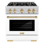 Luxury isn't meant to be desired - it's meant to be attainable. The ZLINE Autograph Edition 30 in. 4.2 cu. ft. Select Dual Fuel Range with 4 Burner Gas Cooktop and Electric Convection Oven in Stainless Steel with White Matte Door and Polished Gold Accents (HDRZ-WM-30-G) combines the elegance of a hand-finished porcelain gas cooktop with 4 Italian-made auto-reignition burners, an electric convection oven with an energy-efficient cooling fan to ensure quiet operation, a beautiful white matte door with a Horizon window design, and stunning polished gold knobs and handle allowing you to master every meal. With a modern, timeless style and refined functionality, ZLINE Select Dual Fuel Ranges are masterfully crafted to deliver an elevated culinary experience.