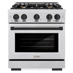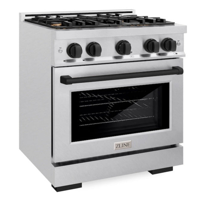 Luxury isn’t meant to be left desired—it’s meant to be attainable. The ZLINE Autograph Edition 30 in. 4.2 cu. ft. Select Gas Range with 4 Burner Cooktop and Convection Gas Oven in Satin Stainless Steel and Matte Black Accents (HGRSZ-30-MB) combines the elegance of a hand-finished porcelain gas cooktop with 4 Italian-made auto-reignition burners, a gas convection oven with an energy-efficient cooling fan to ensure quiet operation, a Horizon oven door window design, and stunning matte black knobs and handle allowing you to master every meal. With a modern, timeless style and refined functionality, ZLINE Select Gas Ranges are masterfully crafted to deliver an elevated culinary experience.