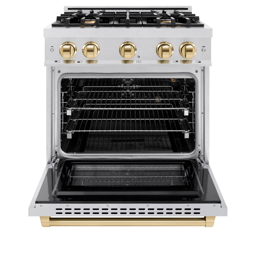 Luxury isn’t meant to be left desired—it’s meant to be attainable. The ZLINE Autograph Edition 30 in. 4.2 cu. ft. Select Gas Range with 4 Burner Cooktop and Convection Gas Oven in Satin Stainless Steel and Polished Gold Accents (HGRSZ-30-G) combines the elegance of a hand-finished porcelain gas cooktop with 4 Italian-made auto-reignition burners, a gas convection oven with an energy-efficient cooling fan to ensure quiet operation, a Horizon oven door window design, and stunning polished gold knobs and handle allowing you to master every meal. With a modern, timeless style and refined functionality, ZLINE Select Gas Ranges are masterfully crafted to deliver an elevated culinary experience.
