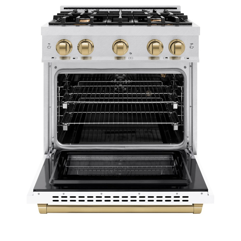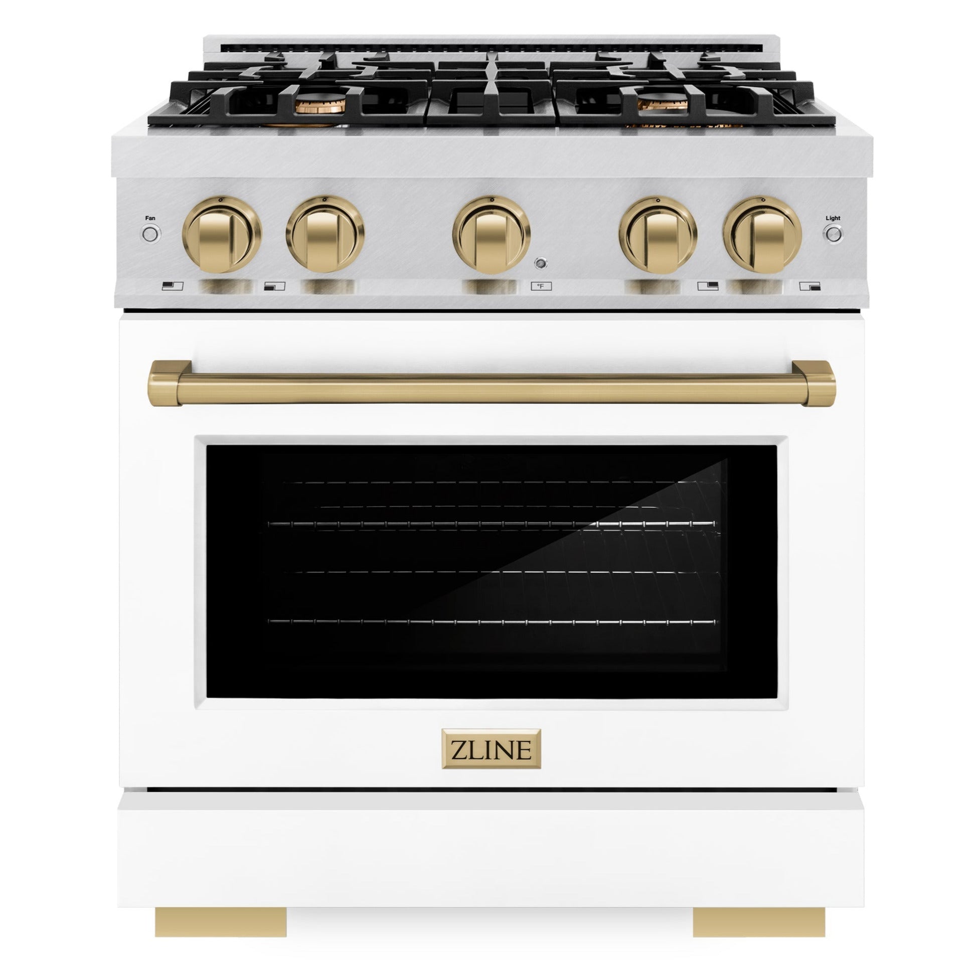 Luxury isn’t meant to be left desired—it’s meant to be attainable. The ZLINE Autograph Edition 30 in. 4.2 cu. ft. Select Gas Range with 4 Burner Cooktop and Convection Gas Oven in Satin Stainless Steel with White Matte Door and Champagne Bronze Accents (HGRSZ-WM-30-CB) combines the elegance of a hand-finished porcelain gas cooktop with 4 Italian-made auto-reignition burners, a gas convection oven with an energy-efficient cooling fan to ensure quiet operation, a beautiful white matte door with a Horizon window design, and stunning champagne bronze knobs and handle allowing you to master every meal. With a modern, timeless style and refined functionality, ZLINE Select Gas Ranges are masterfully crafted to deliver an elevated culinary experience.