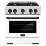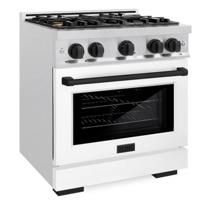 Luxury isn’t meant to be left desired—it’s meant to be attainable. The ZLINE Autograph Edition 30 in. 4.2 cu. ft. Select Gas Range with 4 Burner Cooktop and Convection Gas Oven in Satin Stainless Steel with White Matte Door and Matte Black Accents (HGRSZ-WM-30-MB) combines the elegance of a hand-finished porcelain gas cooktop with 4 Italian-made auto-reignition burners, a gas convection oven with an energy-efficient cooling fan to ensure quiet operation, a beautiful white matte door with a Horizon window design, and stunning matte black knobs and handle allowing you to master every meal. With a modern, timeless style and refined functionality, ZLINE Select Gas Ranges are masterfully crafted to deliver an elevated culinary experience.