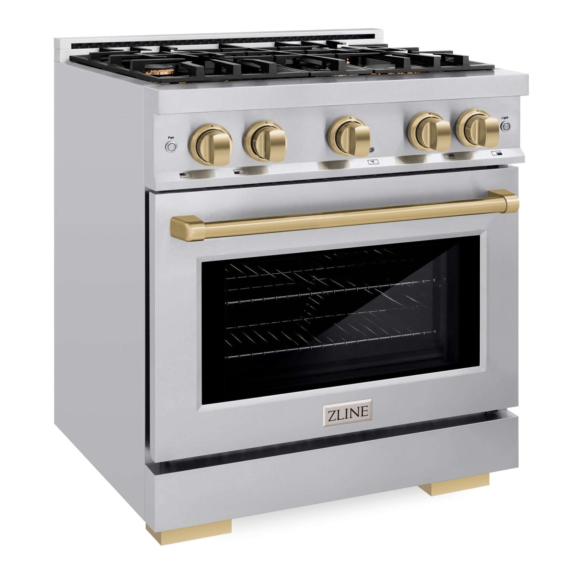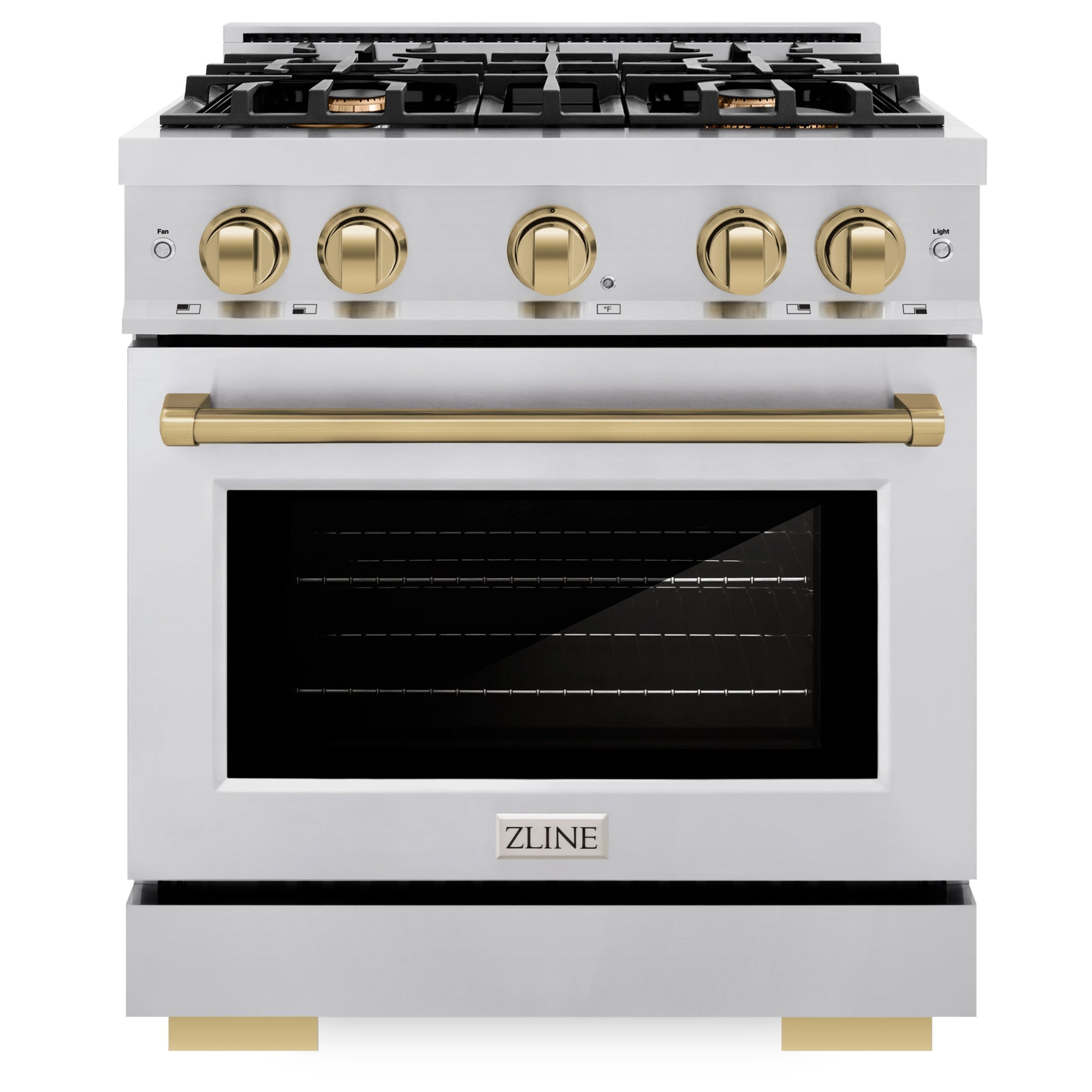 Luxury isn't meant to be desired - it's meant to be attainable. The ZLINE Autograph Edition 30 in. 4.2 cu. ft. Select Gas Range with 4 Burner Cooktop and Convection Gas Oven in Stainless Steel and Champagne Bronze Accents (HGRZ-30-CB) combines the elegance of a hand-finished porcelain gas cooktop with 4 Italian-made auto-reignition burners, a gas convection oven with an energy-efficient cooling fan to ensure quiet operation, a Horizon oven door window design, and stunning champagne bronze knobs and handle allowing you to master every meal. With a modern, timeless style and refined functionality, ZLINE Select Gas Ranges are masterfully crafted to deliver an elevated culinary experience.