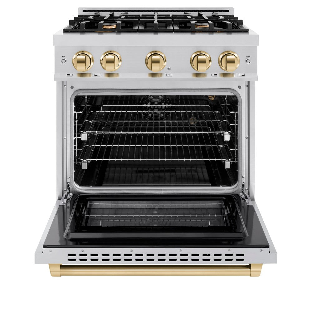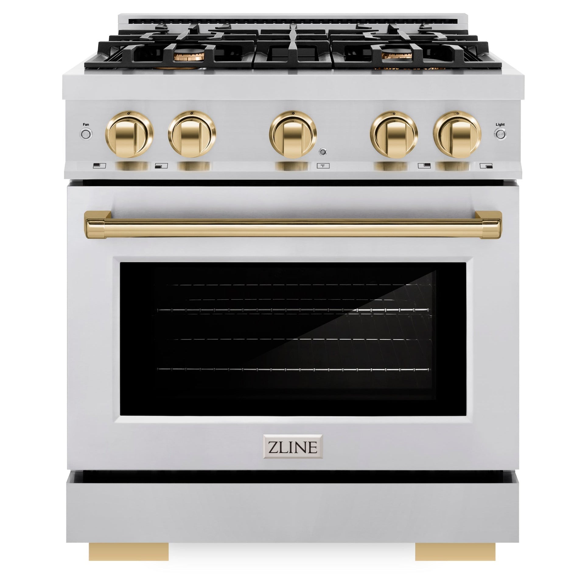 Luxury isn't meant to be desired - it's meant to be attainable. The ZLINE Autograph Edition 30 in. 4.2 cu. ft. Select Gas Range with 4 Burner Cooktop and Convection Gas Oven in Stainless Steel and Polished Gold Accents (HGRZ-30-G) combines the elegance of a hand-finished porcelain gas cooktop with 4 Italian-made auto-reignition burners, a gas convection oven with an energy-efficient cooling fan to ensure quiet operation, a Horizon oven door window design, and stunning polished gold knobs and handle allowing you to master every meal. With a modern, timeless style and refined functionality, ZLINE Select Gas Ranges are masterfully crafted to deliver an elevated culinary experience.