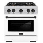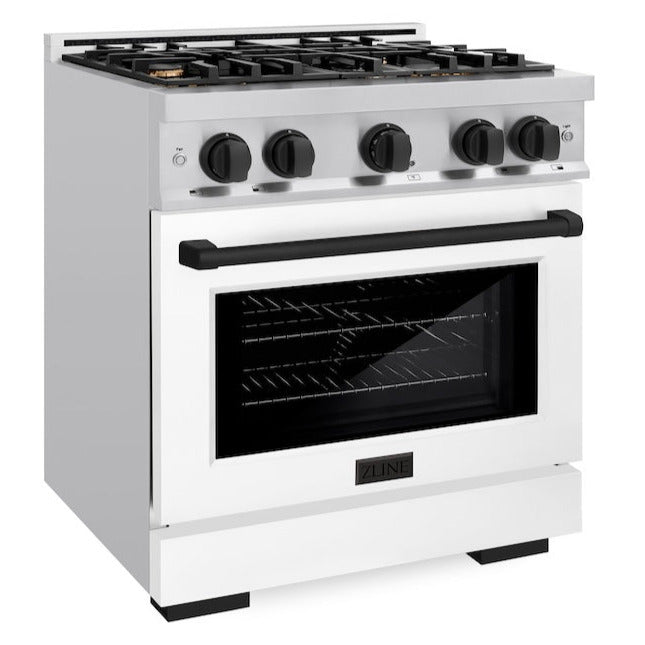 Luxury isn't meant to be desired - it's meant to be attainable. The ZLINE Autograph Edition 30 in. 4.2 cu. ft. Select Gas Range with 4 Burner Cooktop and Convection Gas Oven in Stainless Steel with White Matte Door and Matte Black Accents (HGRZ-WM-30-MB) combines the elegance of a hand-finished porcelain gas cooktop with 4 Italian-made auto-reignition burners, a gas convection oven with an energy-efficient cooling fan to ensure quiet operation, a beautiful white matte door with a Horizon window design, and stunning matte black knobs and handle allowing you to master every meal. With a modern, timeless style and refined functionality, ZLINE Select Gas Ranges are masterfully crafted to deliver an elevated culinary experience.