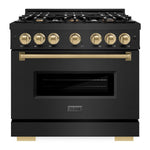 Luxury isn't meant to be desired - it's meant to be attainable. The ZLINE Autograph Edition 36 in. 5.2 cu. ft. Classic Dual Fuel Range with 6 Burner Gas Cooktop and Electric Convection Oven in Black Stainless Steel with Champagne Bronze Accents (CDRBZ-36-CB) combines the elegance of a hand-finished porcelain gas cooktop with 6 Italian-made auto-reignition burners, an electric convection oven with an energy-efficient cooling fan to ensure quiet operation, a Landscape oven door window design, and stunning champagne bronze knobs and handle allowing you to master every meal. With a modern, timeless style and refined functionality, ZLINE Classic Dual Fuel Ranges are masterfully crafted to deliver an elevated culinary experience.