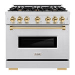 Luxury isn’t meant to be left desired—it’s meant to be attainable. The ZLINE Autograph Edition 36 in. 5.2 cu. ft. Classic Dual Fuel Range with 6 Burner Gas Cooktop and Electric Convection Oven in Satin Stainless Steel with Polished Gold Accents (CDRSZ-36-G) combines the elegance of a hand-finished porcelain gas cooktop with 6 Italian-made auto-reignition burners, an electric convection oven with an energy-efficient cooling fan to ensure quiet operation, a Landscape oven door window design, and stunning polished gold knobs and handle allowing you to master every meal. With a modern, timeless style and refined functionality, ZLINE Classic Dual Fuel Ranges are masterfully crafted to deliver an elevated culinary experience.